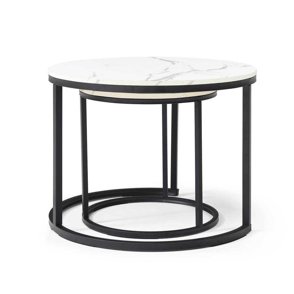 Set 2 Coffee Table Nesting White and gray top Black Frame Circular Round and Marble Pattern Wooden Tables, Living Room Bedroom Apartment Modern Industrial Simple Nightstand