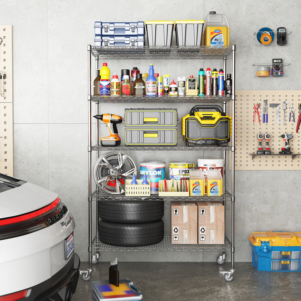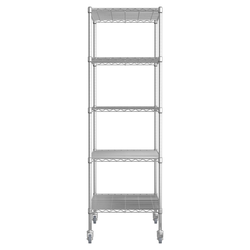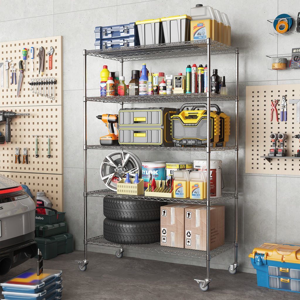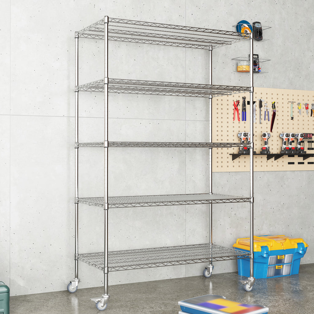 Heavy Duty Adjustable Kitchen Shelving Unit, 5 Tier Wire Storage Shelves with Wheels, Silver Metal, 47''W x 24''D x 72''H