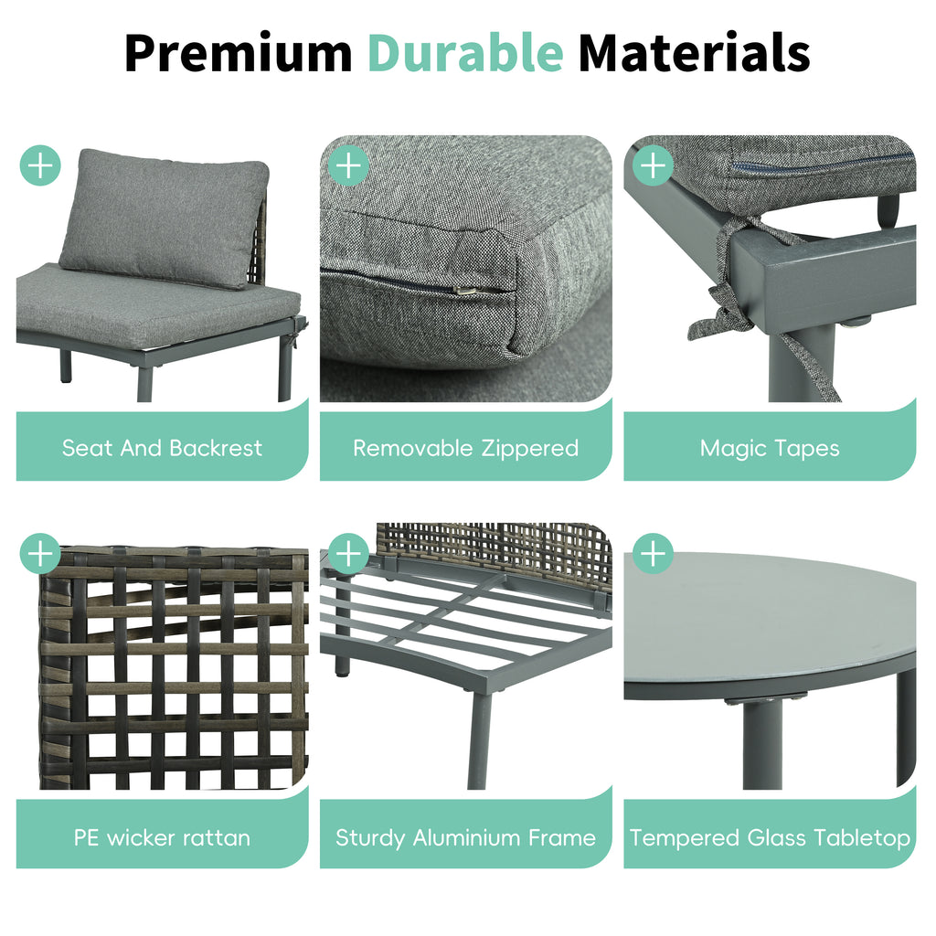 - [Premium Durable Materials]Crafted with a sturdy aluminium frame and high-quality PE wicker rattan(Each sofa supports up to 300 lbs, and each coffee table holds up to 110 lbs), this set is built to withstand outdoor elements. The tempered glass tabletops add a sleek, modern touch while ensuring durability and easy maintenance.