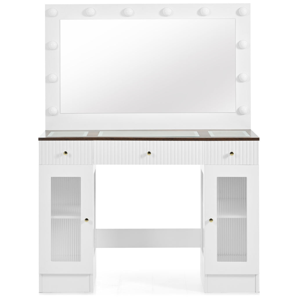 • 3 Lighting Modes & Adjustable Brightness: The dressing table is equipped with a large mirror. There are 12 Hollywood bulbs around the mirror, providing 3 color modes (warm/natural/cool) and adjustable brightness. The dressing table with mirror and light can meet all your different needs, perfect for home makeup, salon and live broadcasting.