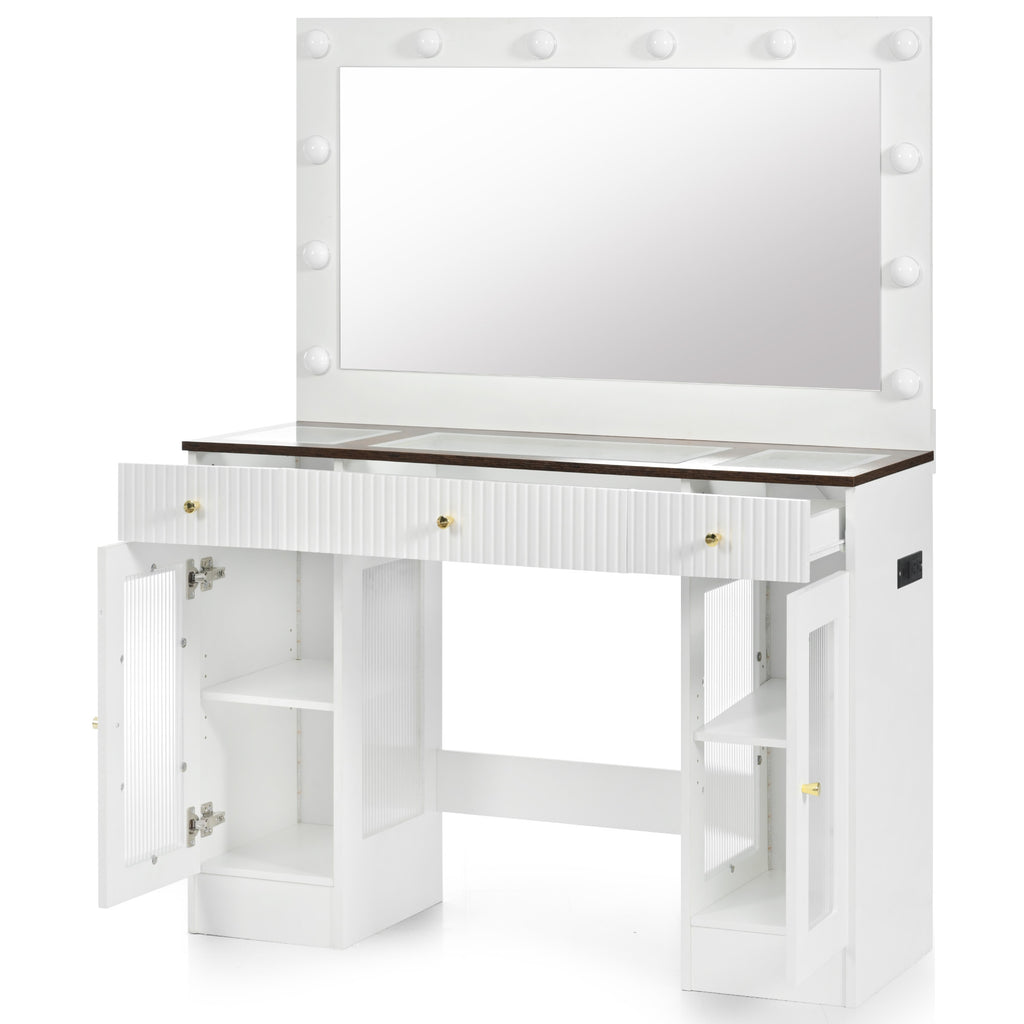 43.3' Vanity Desk with Large Mirror and Hollywood Bulbs, Modern Glass Top Makeup Vanity with Drawers and Power Outlet, Large Dressing Table with 3 Color Lighting Modes & RGB Cabinets for Bedroom