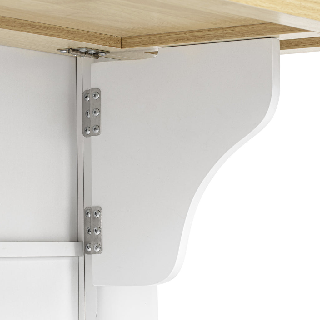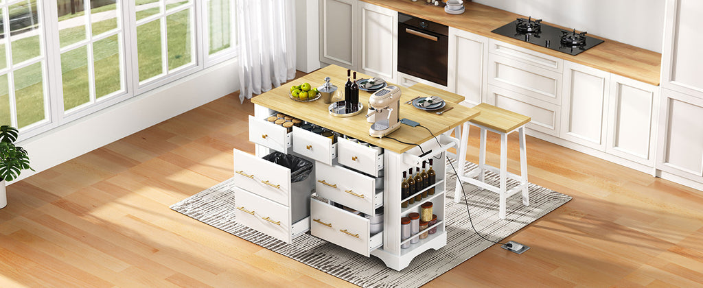 Summary This island is designed to be the perfect ally in your kitchen, blending utility and elegance effortlessly. It comes with six strategically sized drawers: the top ones for utensils, the larger ones for pots, pans, and various containers, and the left bottom two drawers for a 10-gallon trash can (Trash can not included). Two side open shelves with bamboo sticks specifically designed for organizing spices, bottles, and wine. This thoughtful design allows for easy access to frequently used seasonings while cooking. The melamine work surface with drop leaf is not only resistant to scratches and water but also offers a robust and easy-to-maintain countertop for all your culinary activities. With 5 hidden wheels (including 2 lockable wheels), this versatile cart can be easily moved and locked for food prep or storage. Assembly is a breeze with clear instructions.