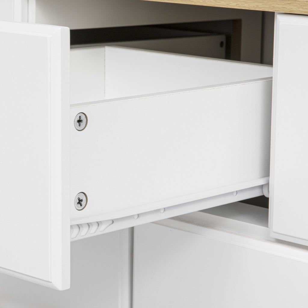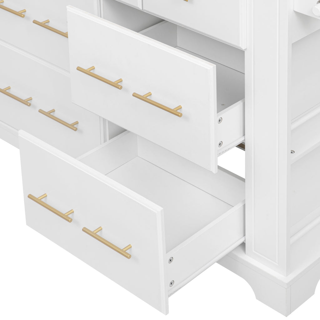 Highlights [6 Drawers Design][Drop Leaf Design] [Vintage Door & Panel Design][Scratch-resistant Melamine Desktop] [Power Outlet 2 AC + 1 USB + 1 Type C] [Pull-out Trash Can Cabinet Designed for 10-Gallon Trash Can] [Ample Storage Space][Spice Rack &Towel Rack] [5* 360 Hidden Rotation Wheels with 2 Lockable Casters] [Eco-friendly manufactured P2 MDF Board]