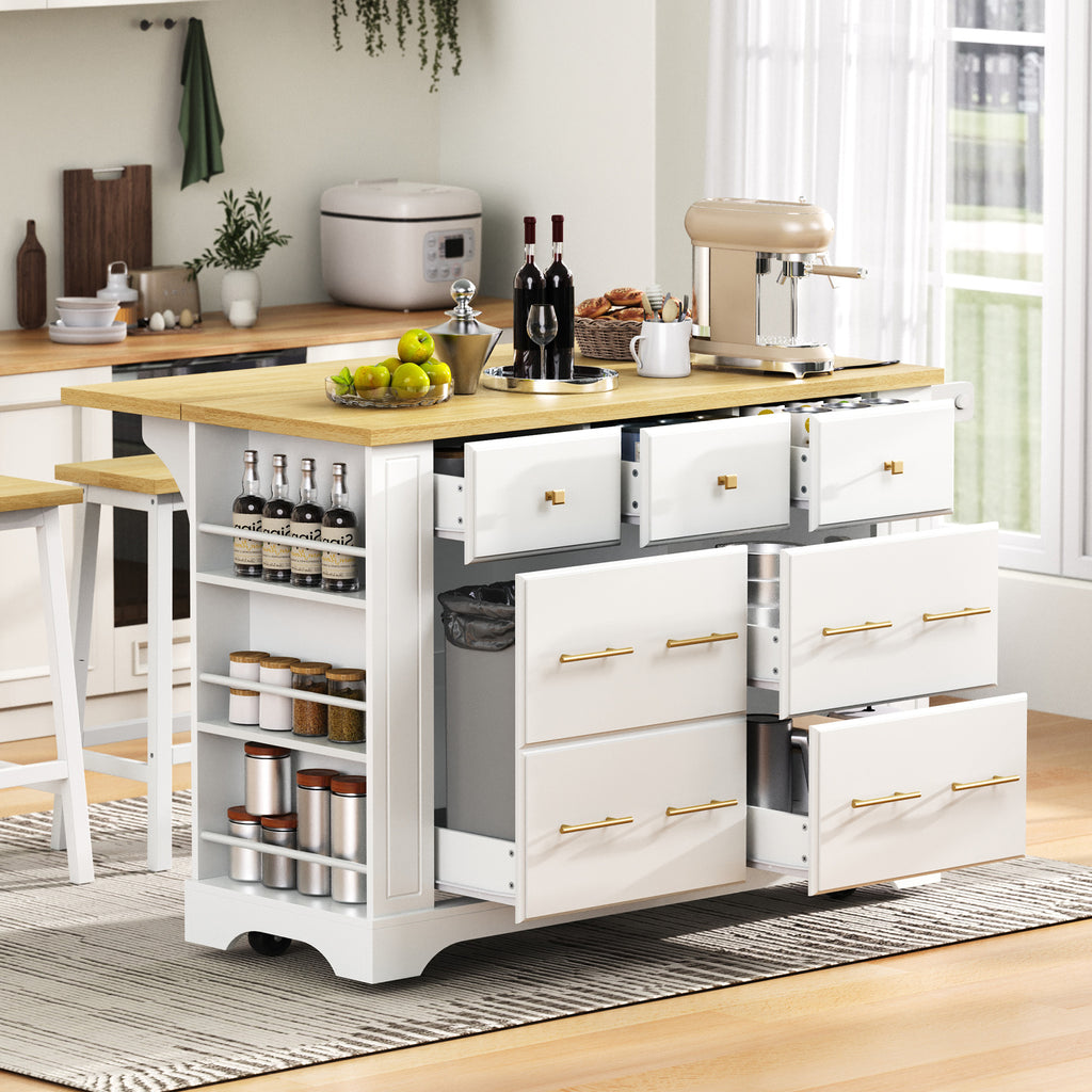 K&K Kitchen Island with 6 Drawers, Pull Out Trash Can Storage, Rolling Kitchen Island on 5 Wheels with Drop Leaf, Power Outlet, 5 Open Side Racks for Kitchen, Dining Room, White