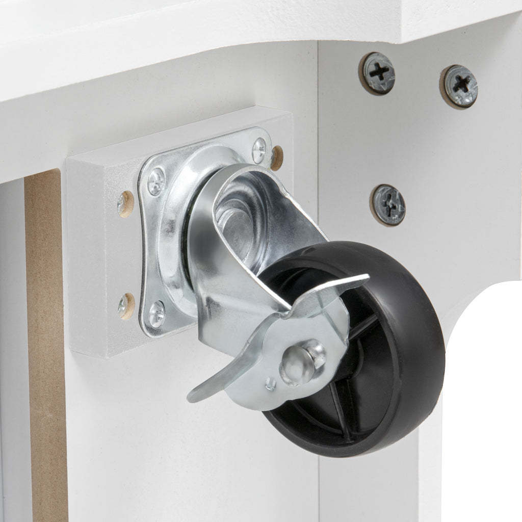 This mobile kitchen island on wheels is equipped with five universal wheels (two of which are lockable). The central placement of one wheel at the base ensures enhanced overall stability during movement.