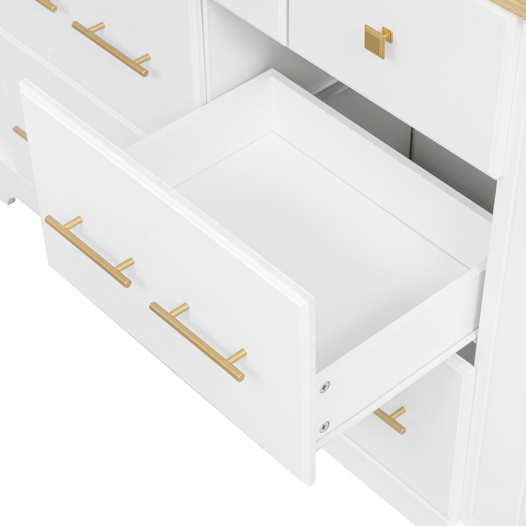 • [Classic & Rustic Aesthetics] The natural texture of the wood brings a sense of authenticity and character to your kitchen space, while the vintage design adds a touch of nostalgia and style. Designed with beveled edge and a curved kickboard on the furniture exterior, our dressers exude sophistication and elegance. The modern golden metal handle provides a classic finishing touch, making it the perfect storage solution for your kitchen essentials.