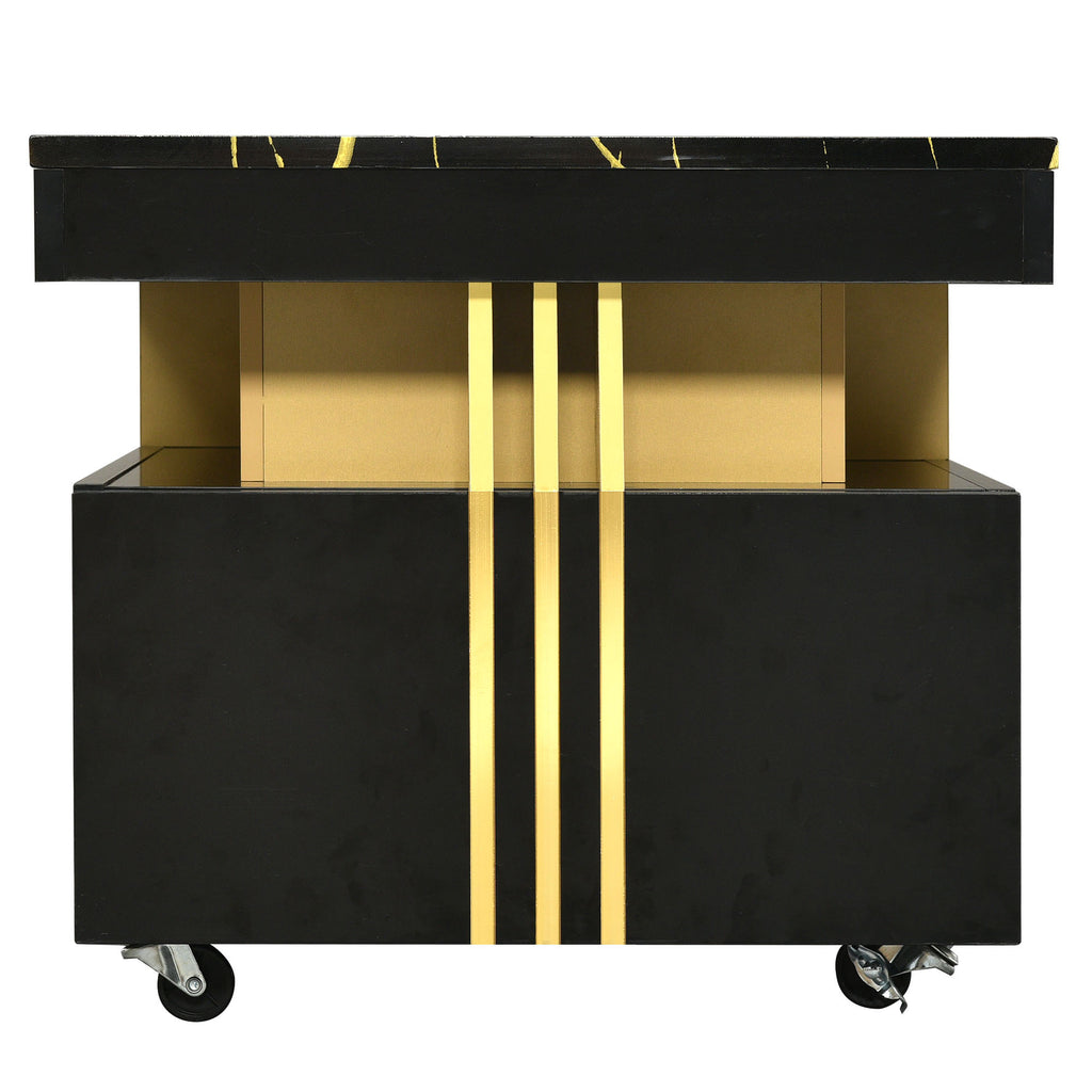 This coffee table is an upgrade of modern elegance, with its faux marble tabletop that offers a sleek surface for displaying decor and serving drinks. The gold metal bars embedded in the panels also add a touch of glamour and luxury.
