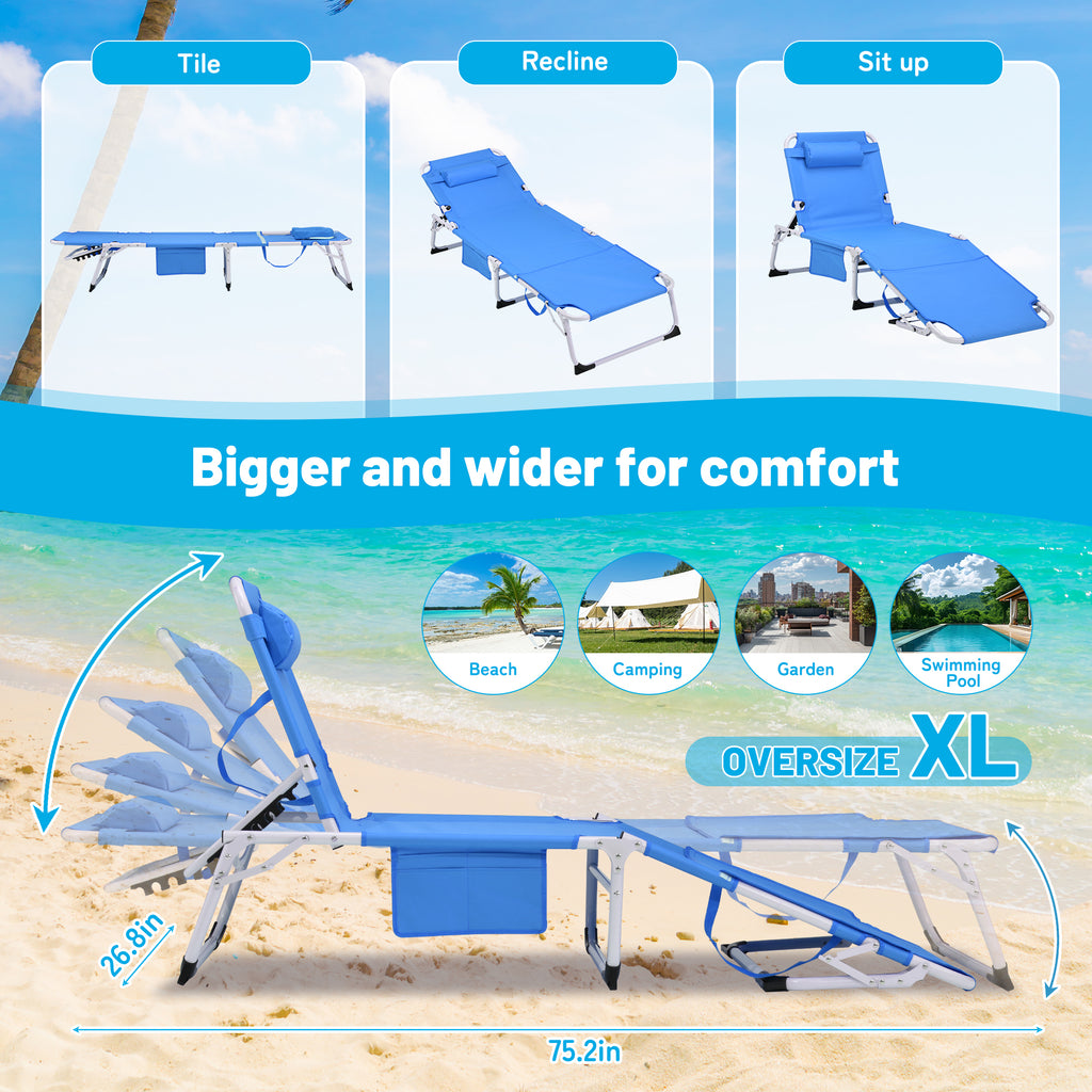 • 【Sturdy Frame】The Frame of the adjustable lounge chair adopted by durable round tube.Weight capacity up to 400 pounds.Besides,the adjustable folding chair comes with a soft pad which is made by cotton,and it is soft for skin, comfortable and breathable.Equiped with a removable pillow and side pocket to ensure a comfortable support for your neck and head when you are sleeping on it.