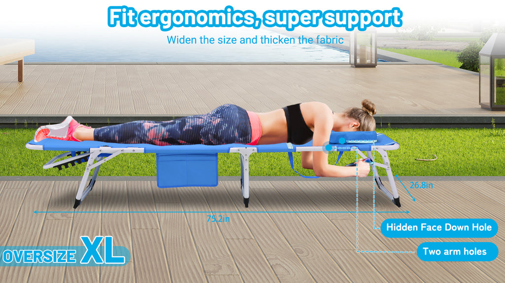 • 【ADJUSTABLE 5 POSITION LOUNGE CHAIR】 : Designed with 5 positions adjustable locking system, this sturdy folding cot allows you to adjust it to a comfortable position as your needs.You can recline or lay flat.This ergonomic design is good for your back, can also help reducing muscle tension and stress.Updated locker system can make sure the sturdy of the chair when you lay on it.