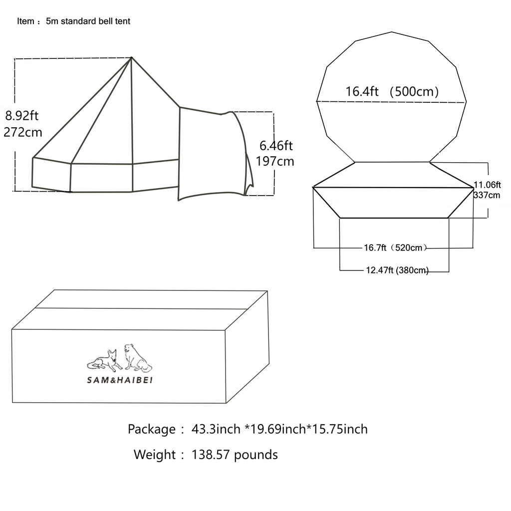 380g polyester cotton Size: diameter 5m bell tent, the top height of 350 cm, side wall height of 80 cm, door high of 160cm. It is a polygonal base and can accommodate 7-10 people( can place 2 king size bed), chimney hole on side wall. Fabric & pole: Fabric made of waterproof and 380g cotton canvas with waterproof, without PU coating , color of off white; 12*500mm pegs 8*230mm groundsheet pegs: ykk zipper, wooden pole.