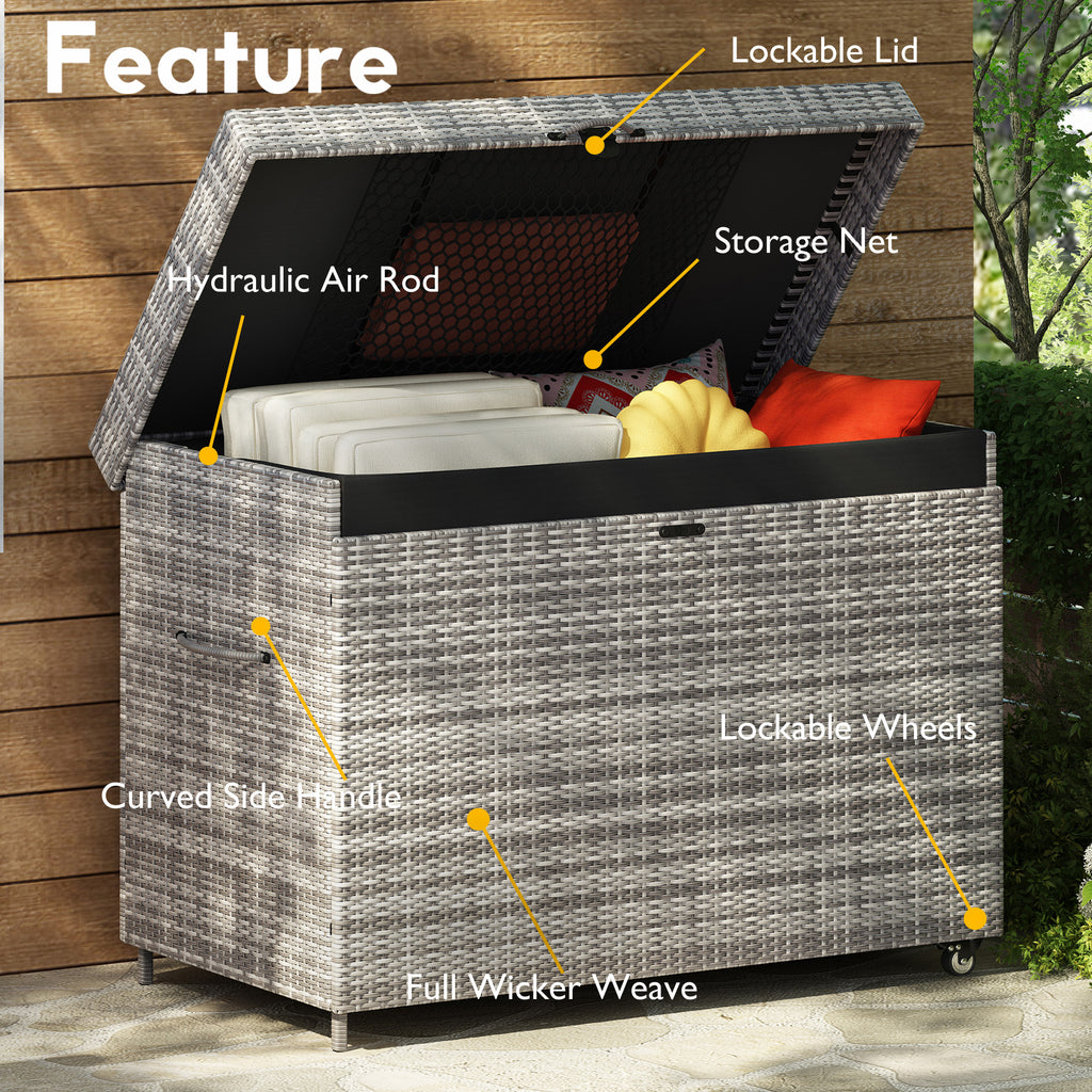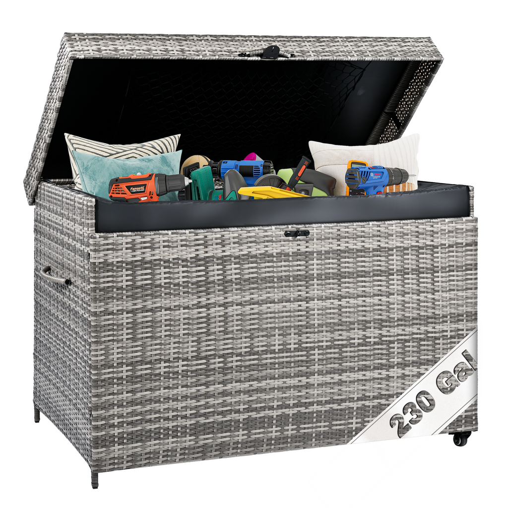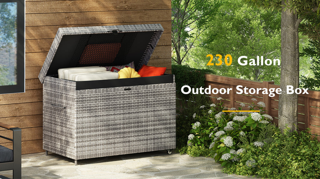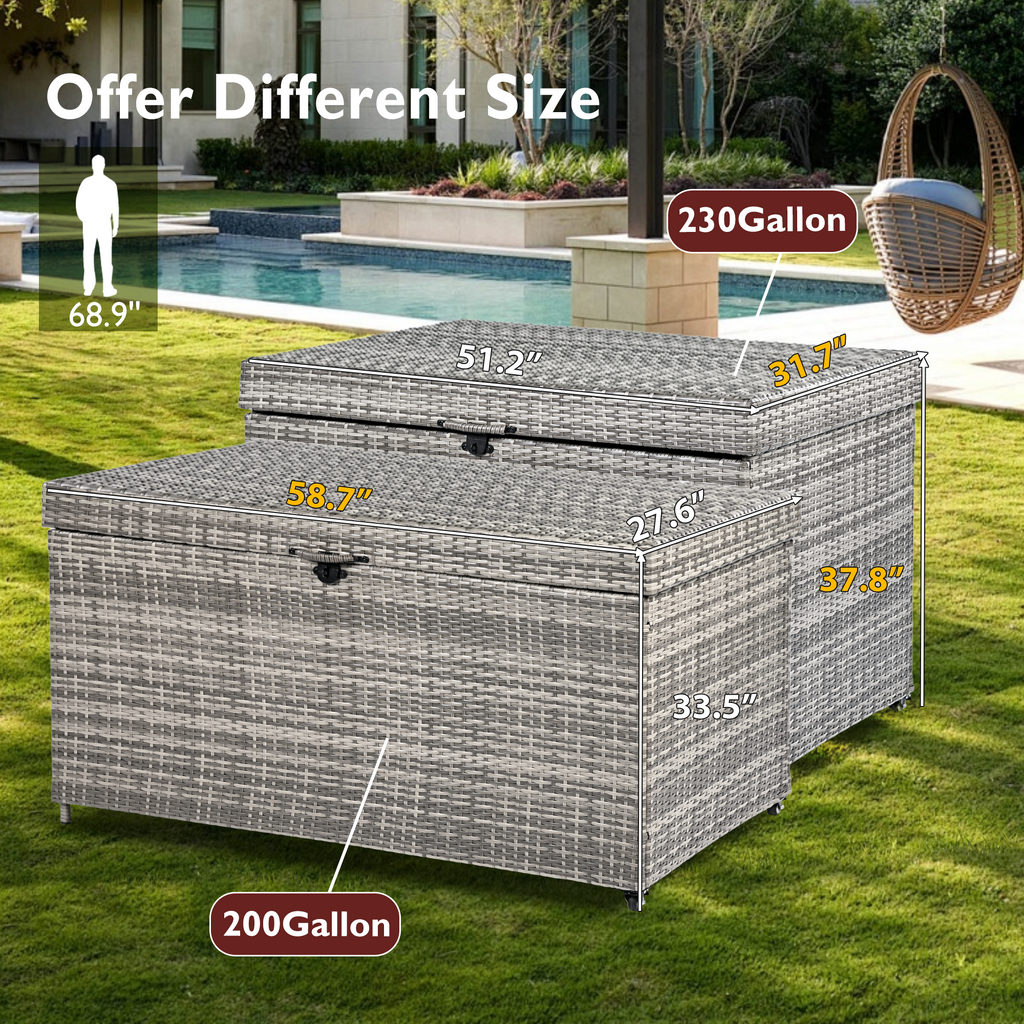 Highlights | [Spacious 230-Gallon Capacity][Steel Strip Bar Support] [1000H UV Resistant Wicker][Upgrade Hydraulic Pistons] [Lockable Lid][Full Coverage Lid][Smooth Front Lockable Wheels][Sturdy Handle] [Lower Front Board][Non-slip Feet][Weather-resistant Liner][Inner Bag] |