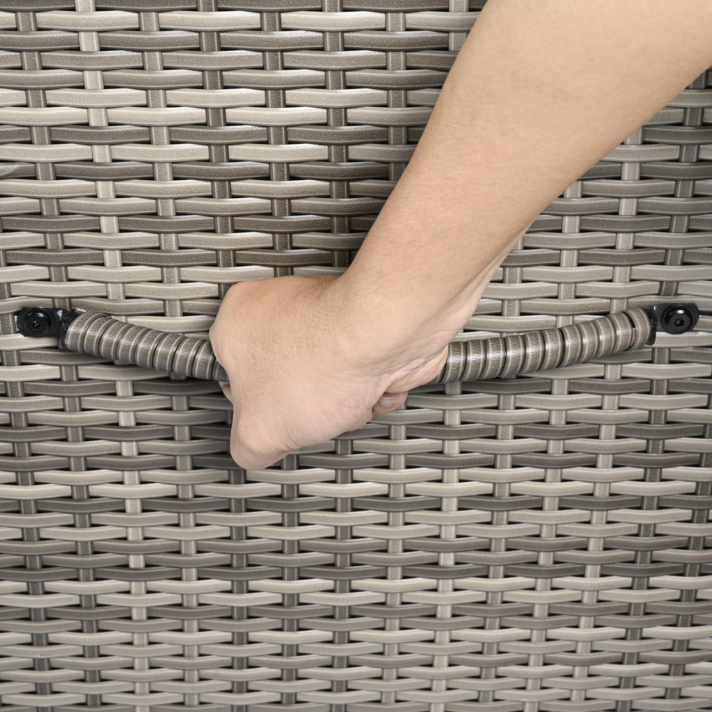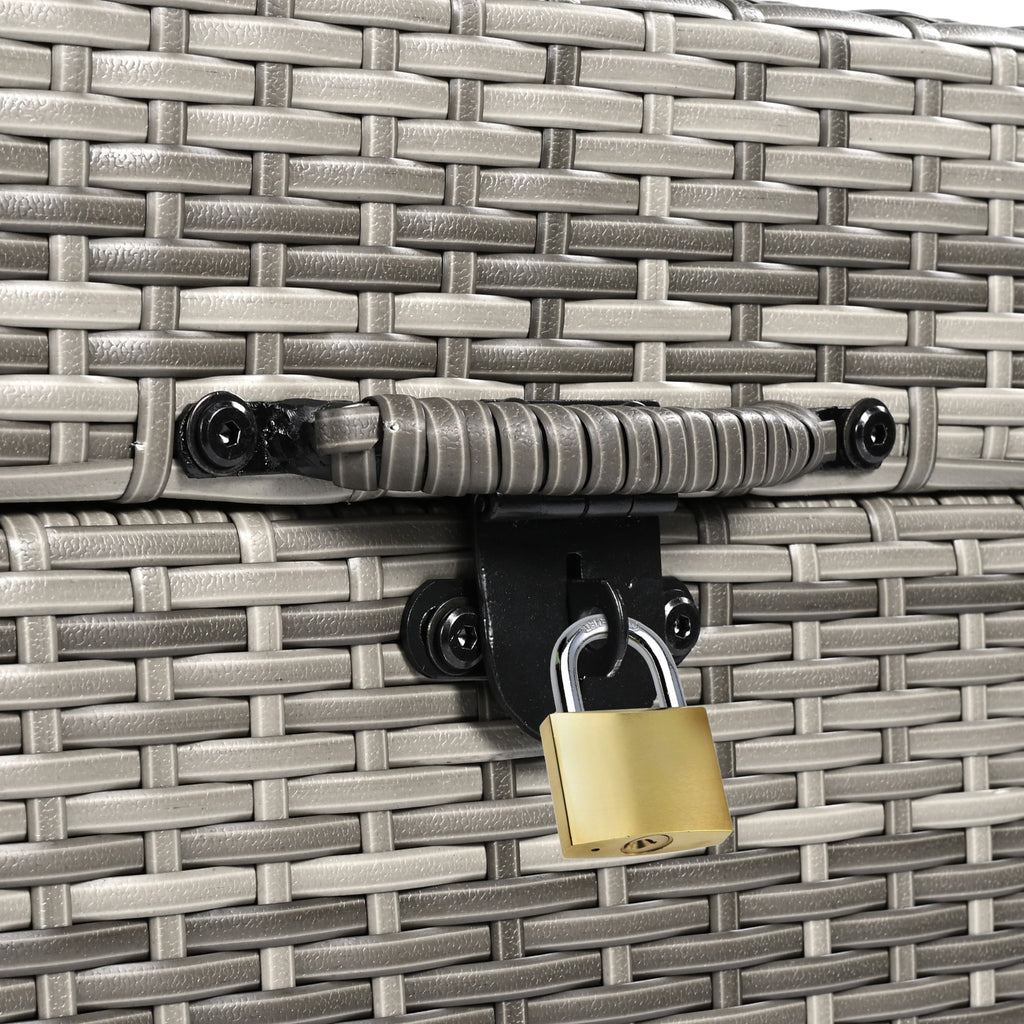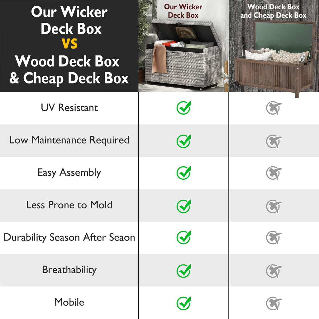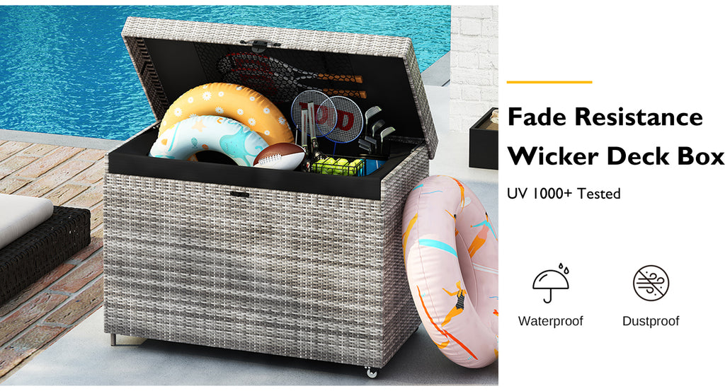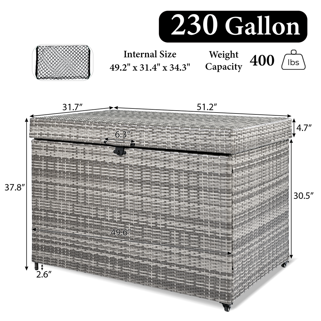 Highlights | [Spacious 230-Gallon Capacity][Steel Strip Bar Support] [1000H UV Resistant Wicker][Upgrade Hydraulic Pistons] [Lockable Lid][Full Coverage Lid][Smooth Front Lockable Wheels][Sturdy Handle] [Lower Front Board][Non-slip Feet][Weather-resistant Liner][Inner Bag] |