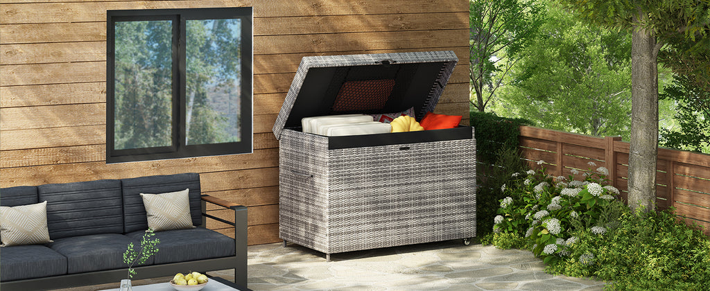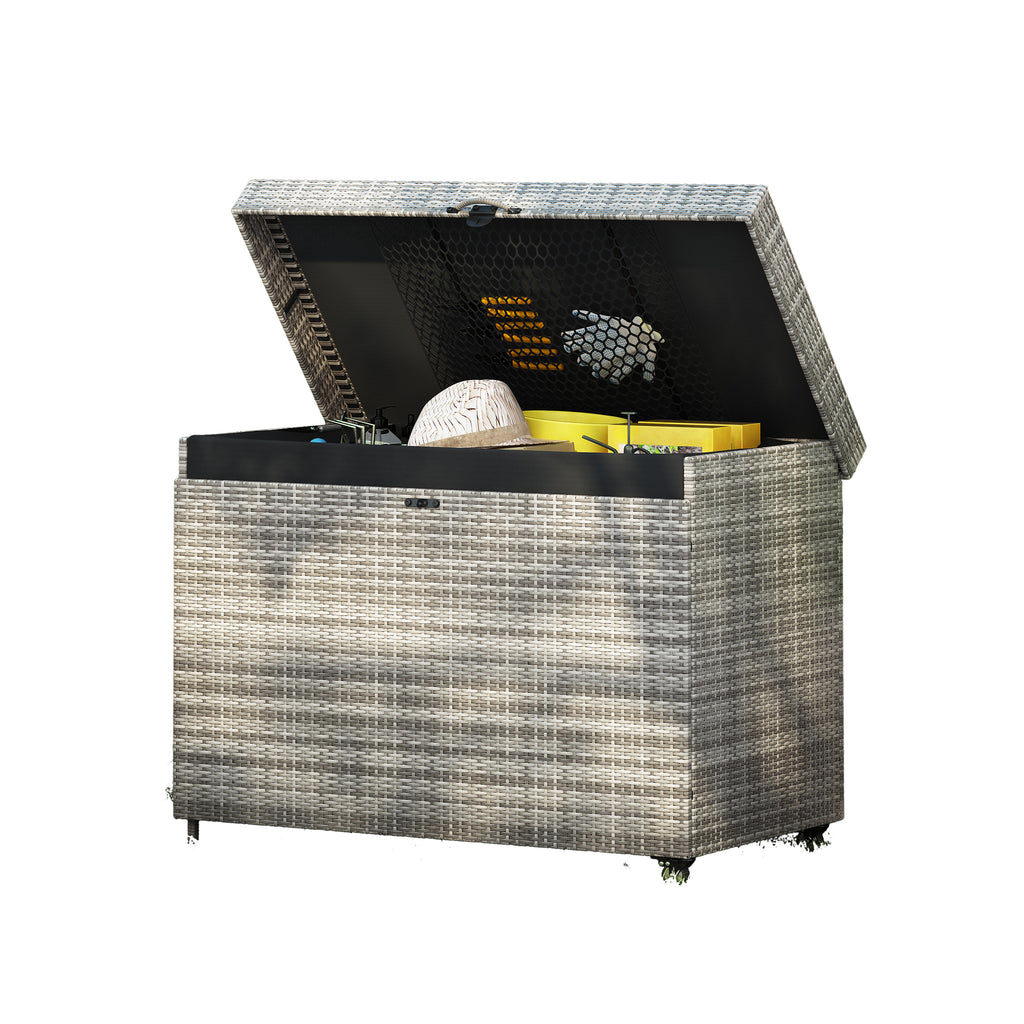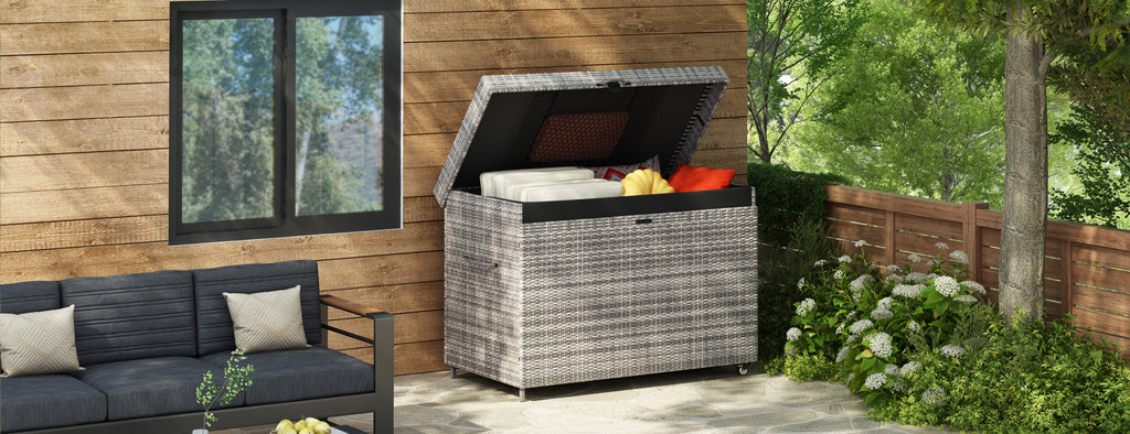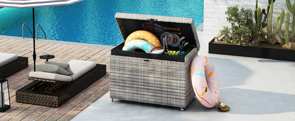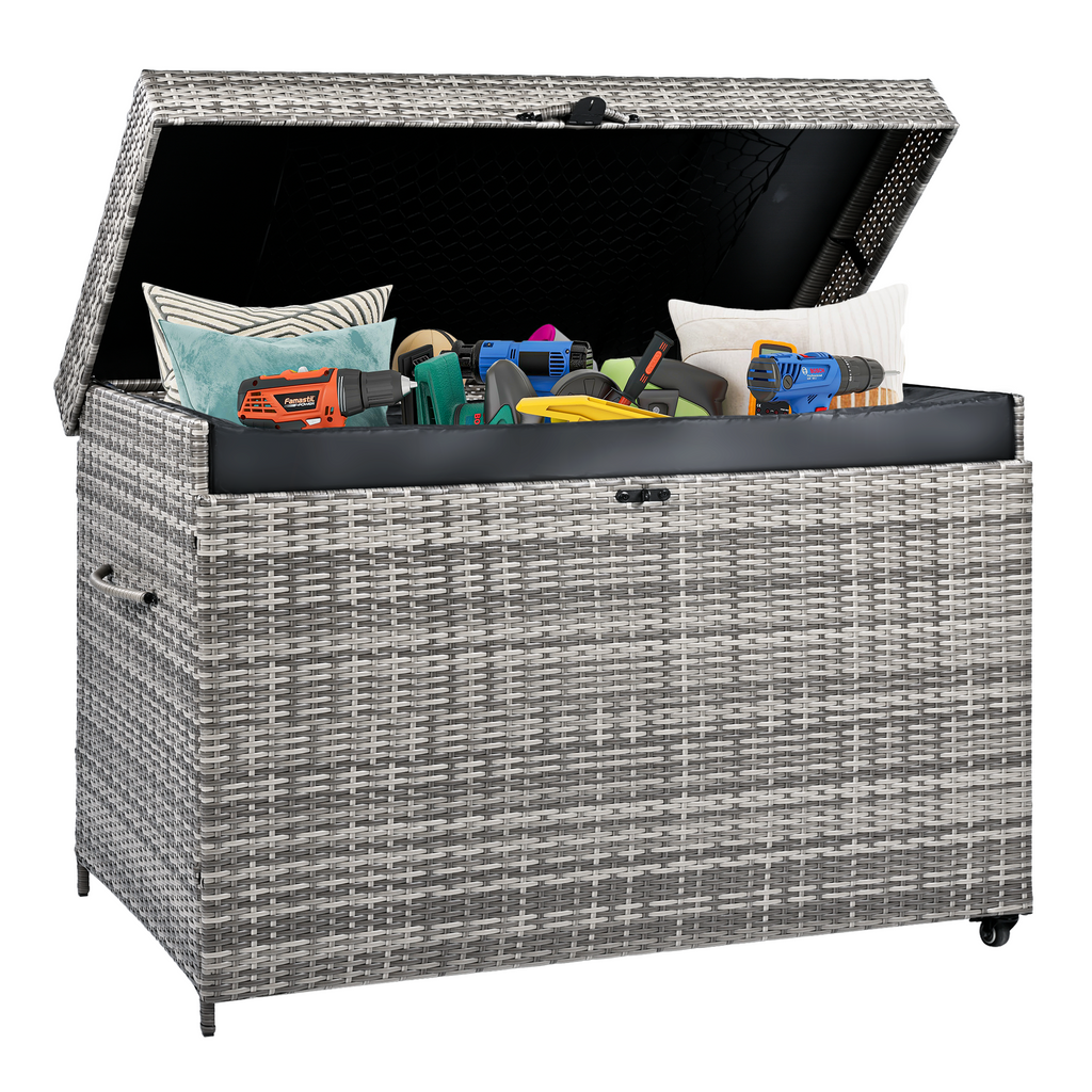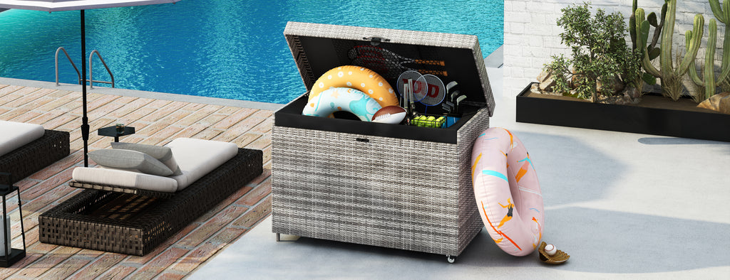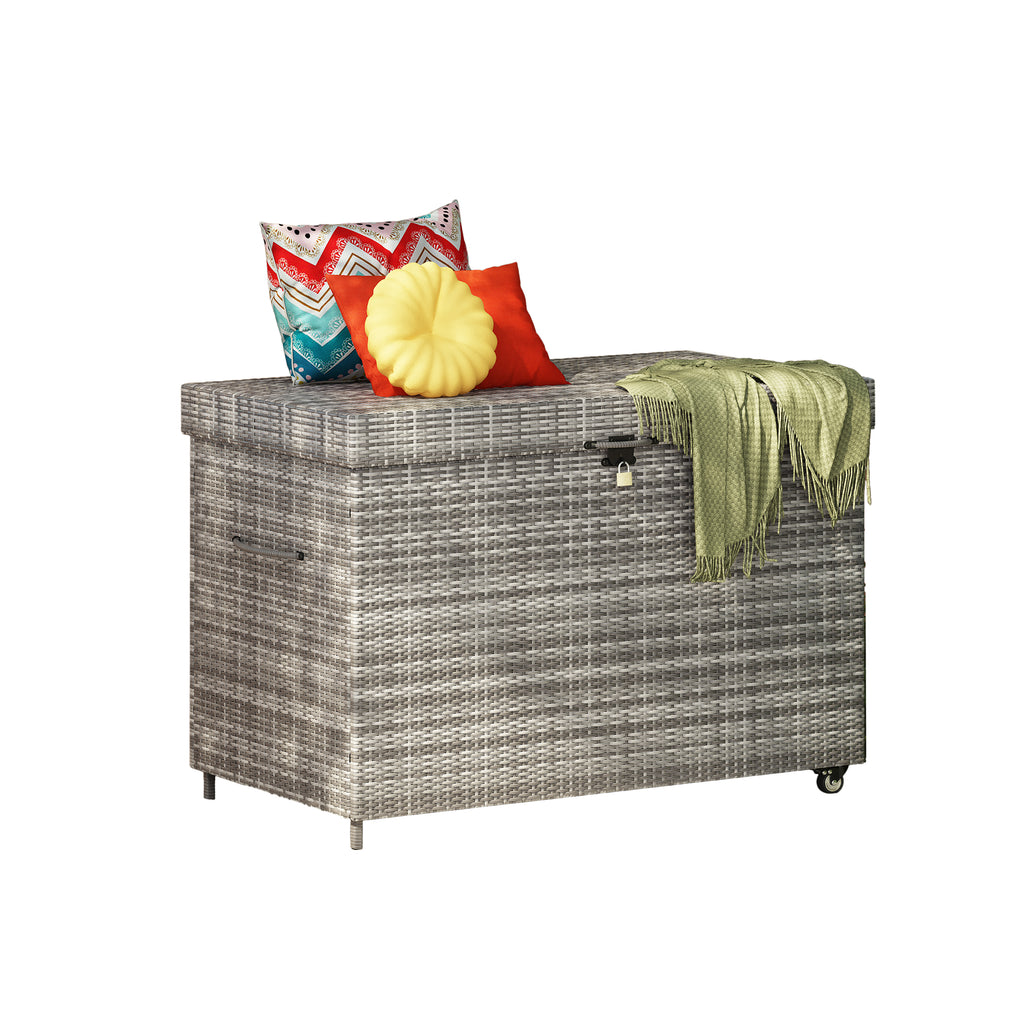 Summary | Imagine a magical storage box that protects your outdoor treasures from wild storms and intense sunlight, while providing a smooth lid-opening experience similar to uncovering a treasure chest. Crafted with a robust steel frame surrounded by all-weather wicker, it resists rust and deformation, remaining steadfast against nature's moods. The large deck box is ingeniously designed with a lockable lid (lock not included), offering the highest level of security and the peace of mind you truly deserve to safeguard your belongings. Two smoothly rolling and lockable wheels further enhance its versatility, allowing you to smoothly move the 230-gallon deck box across various surfaces. This spacious 230-gallon hideaway serves as a haven for cushions, pool supplies, and garden tools, ensuring a tidy refuge. Ideal for any outdoor oasis that desires both style and durability. |