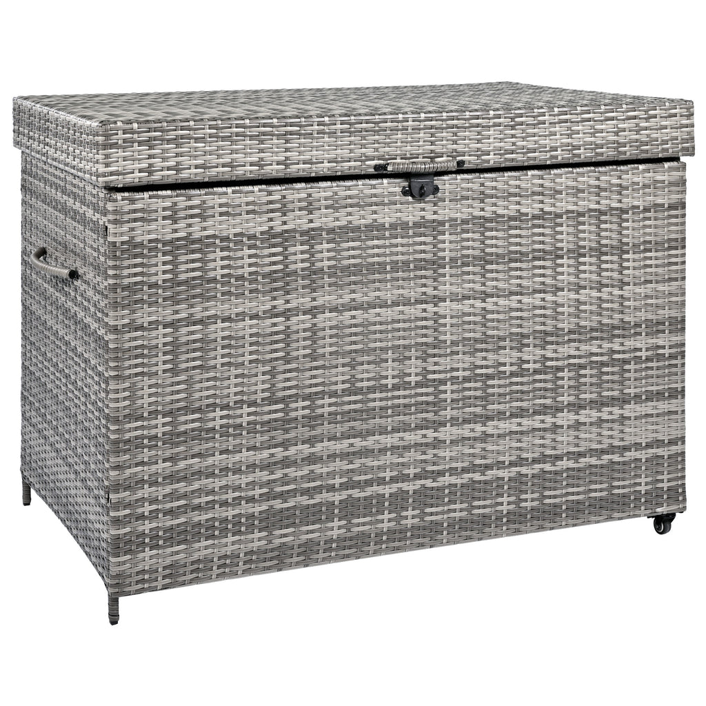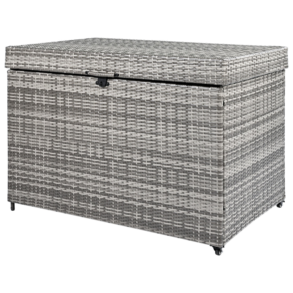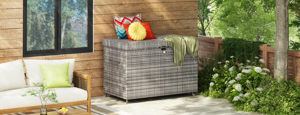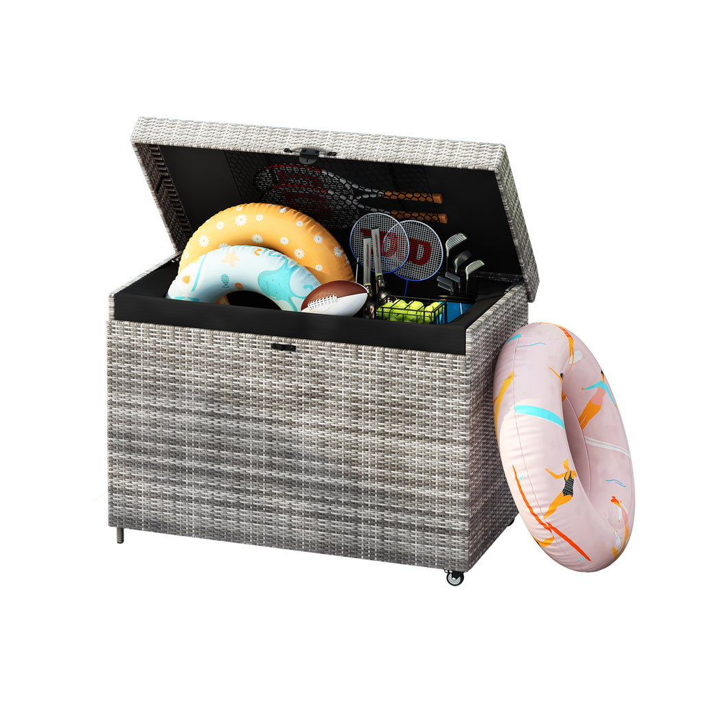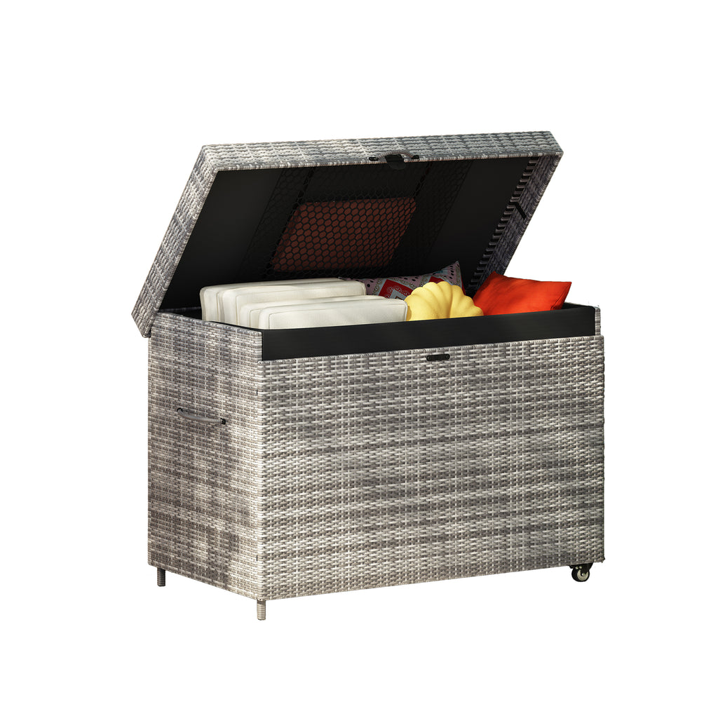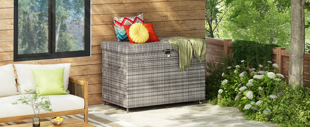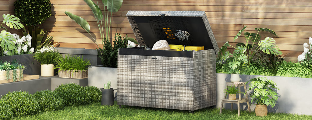 Summary | Imagine a magical storage box that protects your outdoor treasures from wild storms and intense sunlight, while providing a smooth lid-opening experience similar to uncovering a treasure chest. Crafted with a robust steel frame surrounded by all-weather wicker, it resists rust and deformation, remaining steadfast against nature's moods. The large deck box is ingeniously designed with a lockable lid (lock not included), offering the highest level of security and the peace of mind you truly deserve to safeguard your belongings. Two smoothly rolling and lockable wheels further enhance its versatility, allowing you to smoothly move the 230-gallon deck box across various surfaces. This spacious 230-gallon hideaway serves as a haven for cushions, pool supplies, and garden tools, ensuring a tidy refuge. Ideal for any outdoor oasis that desires both style and durability. |