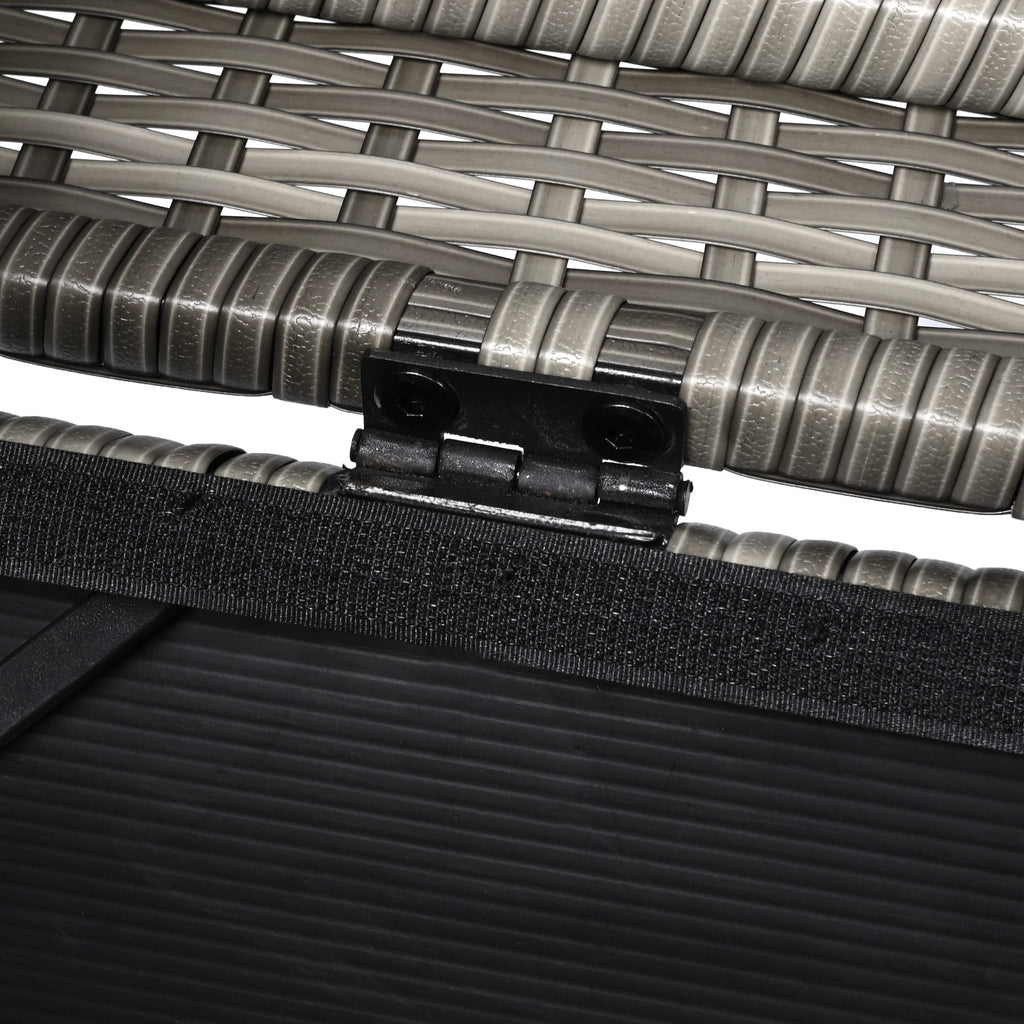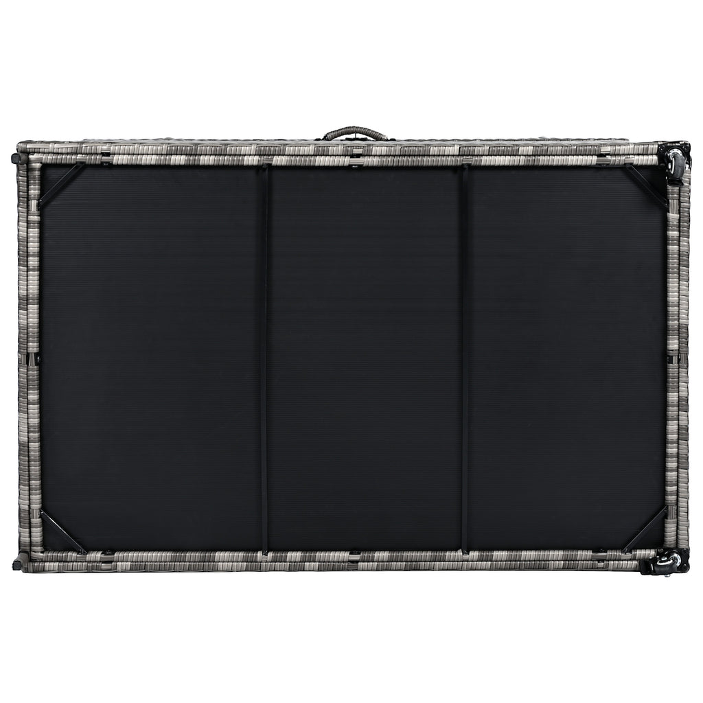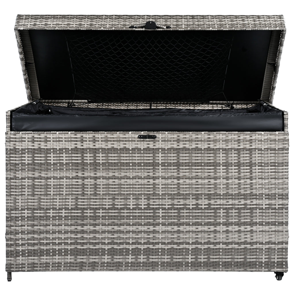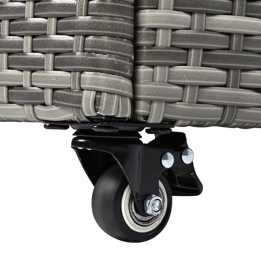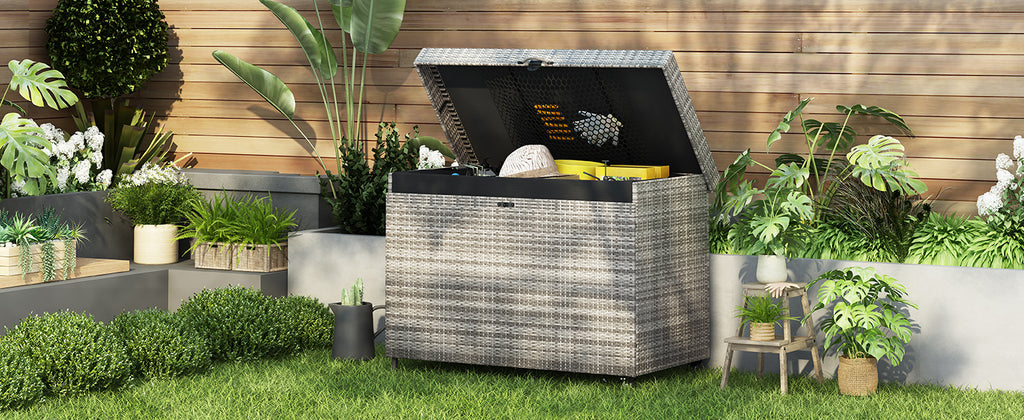 Summary | Imagine a magical storage box that protects your outdoor treasures from wild storms and intense sunlight, while providing a smooth lid-opening experience similar to uncovering a treasure chest. Crafted with a robust steel frame surrounded by all-weather wicker, it resists rust and deformation, remaining steadfast against nature's moods. The large deck box is ingeniously designed with a lockable lid (lock not included), offering the highest level of security and the peace of mind you truly deserve to safeguard your belongings. Two smoothly rolling and lockable wheels further enhance its versatility, allowing you to smoothly move the 230-gallon deck box across various surfaces. This spacious 230-gallon hideaway serves as a haven for cushions, pool supplies, and garden tools, ensuring a tidy refuge. Ideal for any outdoor oasis that desires both style and durability. |