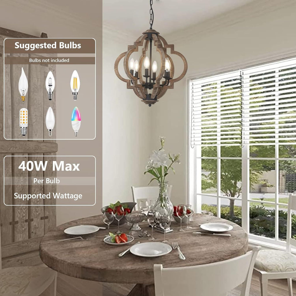• ❀This farmhouse chandelier for dining room will bring a cottage chic style and refreshing feel to your home decoration. If you want to renovate your house or need to update your existing old fixtures, don't miss this modern farmhouse light fixture! With the black iron structures, candelabra base and old wooden distressed finish, this farmhouse dining room light fixtures over table gives you a thick sense of history.