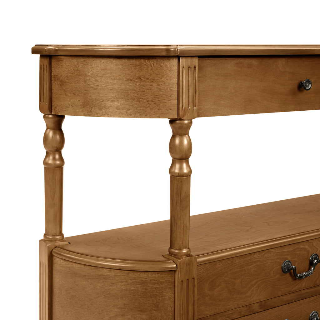 • Romanesque Character: The circular curved design at the ends, as well as the austere lines of craftsmanship, give this console table a Romanesque character. The details of each part of the craftsmanship are also particularly rigorous and exquisite. The layered design of the tabletop edge and the double-layer design of the edge of the base plate reflect the sophistication of classical art. The ends of the tapered table legs are decorated with an hourglass design, which makes table more ornamental