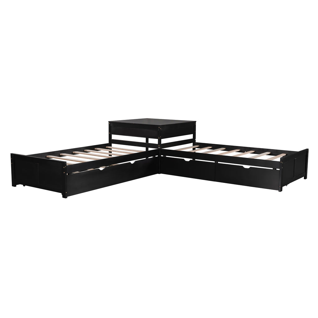 L-shaped Platform Bed with Trundle and Drawers Linked with Built-in Desk, Twin, Espresso, Pine Wood, 119.6''L x 119.6''W x 30''H