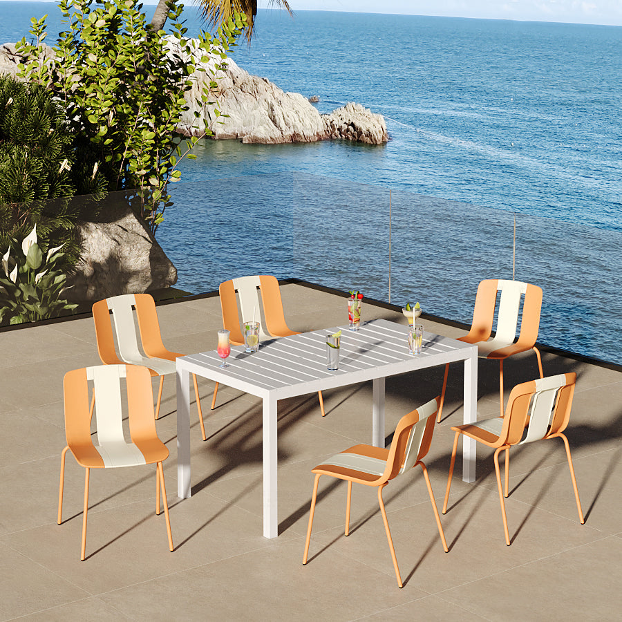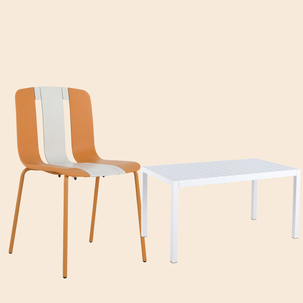 4-Pack Modern Striped Color Block Chairs-Indoor/Outdoor PP Seat & Sturdy Metal Legs, White, Orange, Beige with 55 Inch White Modern Long Table - Indoor/Outdoor- Lightweight PP Tabletop with Metal