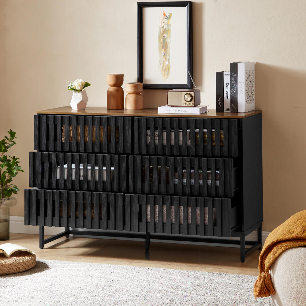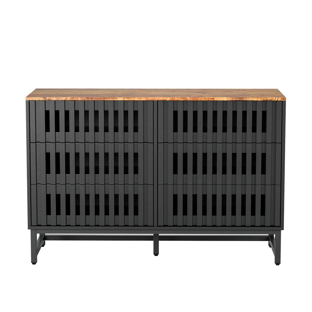 6 Drawer Double Dresser with Slatted Grille Striped Drawer, Modern Style Dresser, High-Quality MDF and Metal Leg