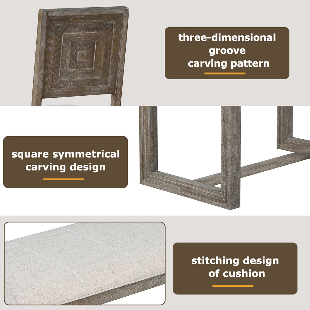 - Notable Details: The trestle bases of the table and bench are designed with a three-dimensional groove carving pattern, which is complemented by the square symmetrical carving of the backrests of the chairs. At the same time, the stitching on the surface of the bench cushion makes the already-filled cushion look even fuller and more comfortable. In short, our elegant dining set features a cohesive design that enhances any dining room decor, creating a warm and inviting ambiance.