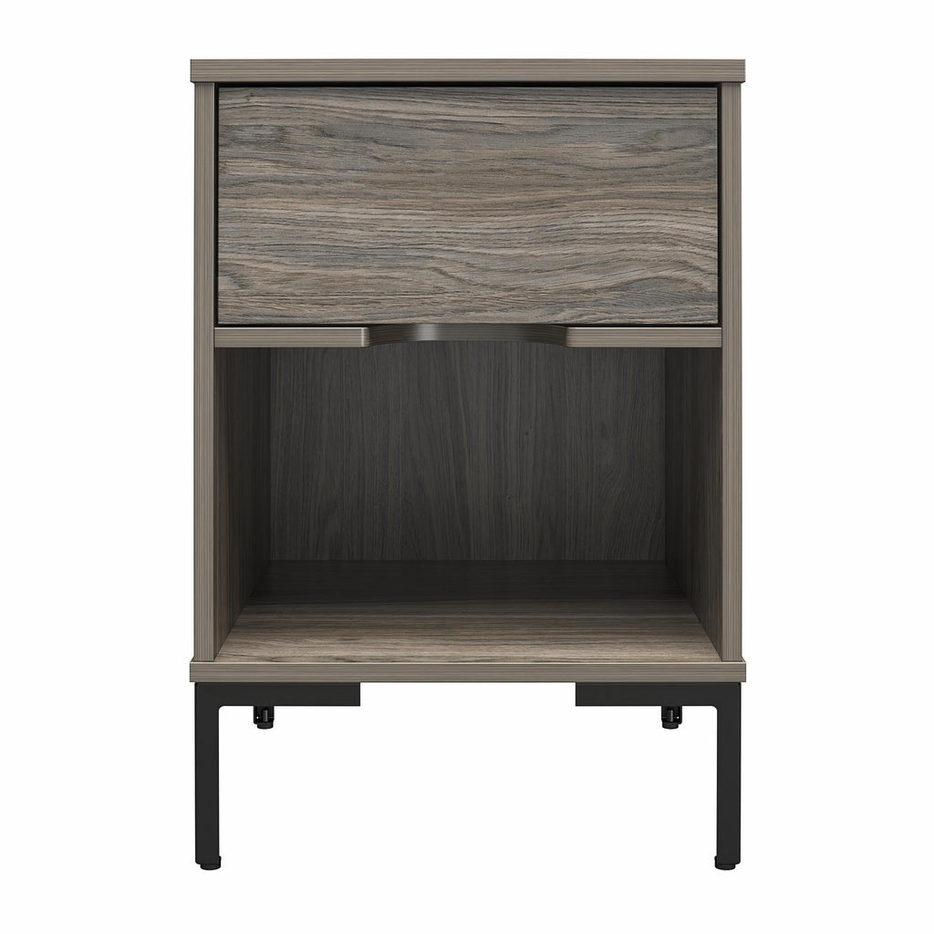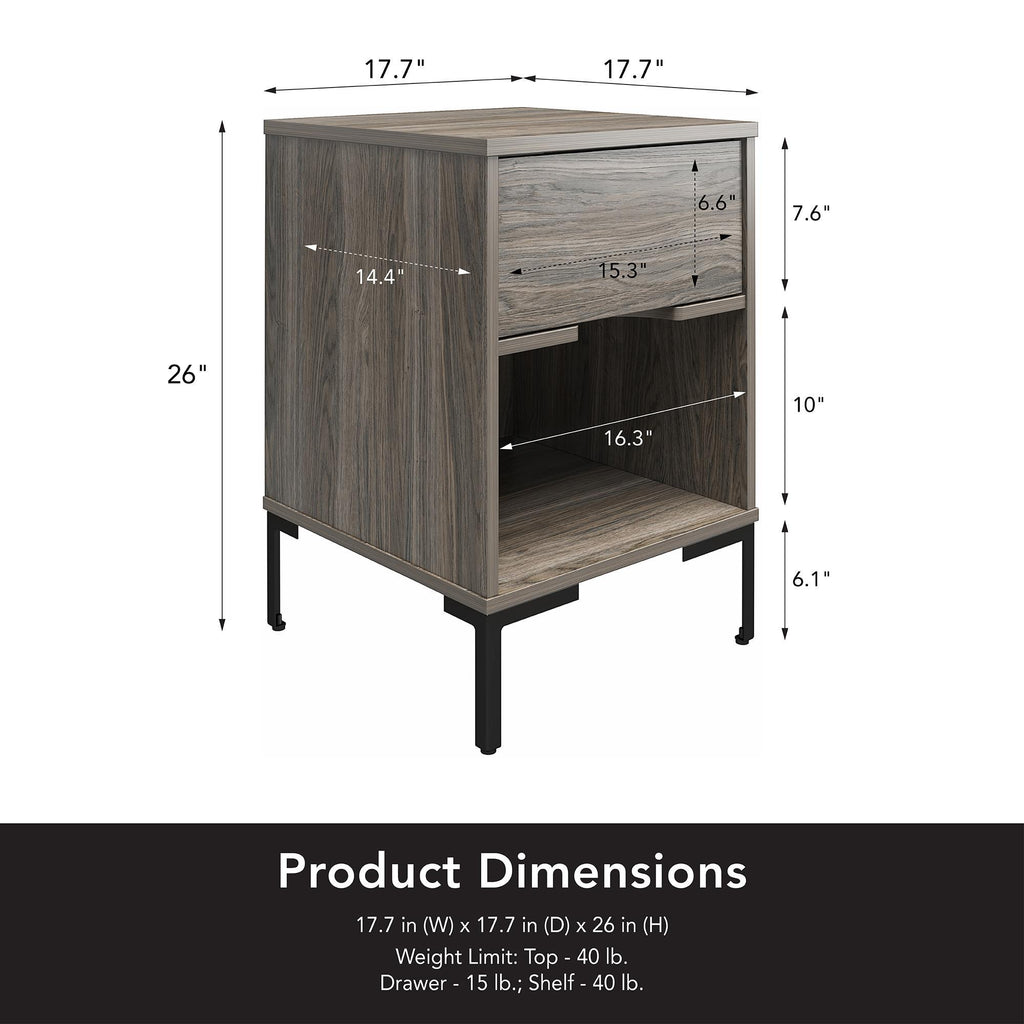 It's time to stop losing sleep over poor décor and give your bedroom a little face lift with the rustic, yet refined, Rolland collection. This simplified take on utilitarian forms is edgy enough to take on industrial spaces with a nod toward sophisticated elegance. The Nightstand features a spacious drawer for bedside belongings and is constructed from durable MDF and engineered wood atop black powder coated metal legs. An open storage space below the drawer presents the perfect place for books and allows ample space for personal items, while the cut-out handle gives the Nightstand a sleek, modern persona. This nightstand ships flat to your door. Two adults are recommended for assembly. Assembled dimensions: 17.7'W x 17.7'D x 26'H. Top and open shelf can each hold up to 40 lbs. Drawer can hold up to 15 lbs.