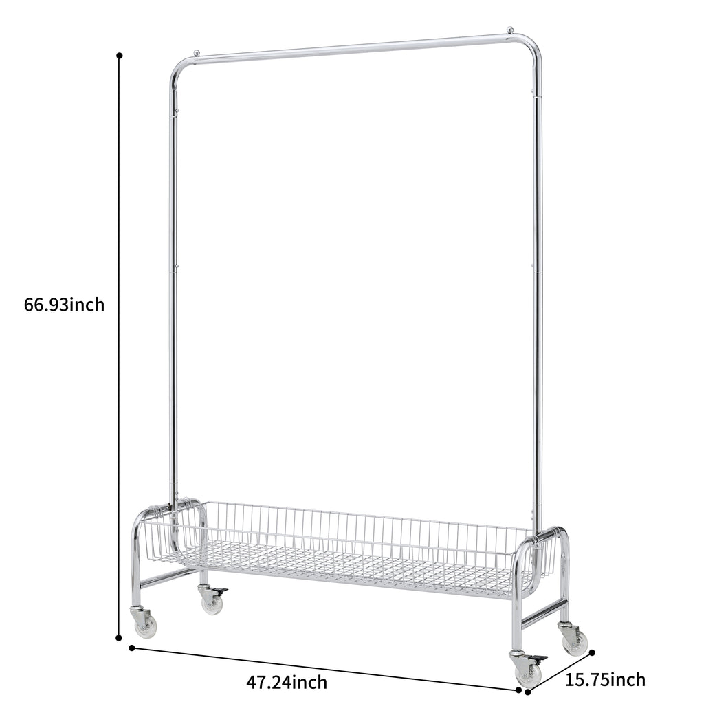 Heavy Duty Silver Iron Garment Rack with Basket on Wheels, 47.24 x 15.75 x 66.93 Inches
