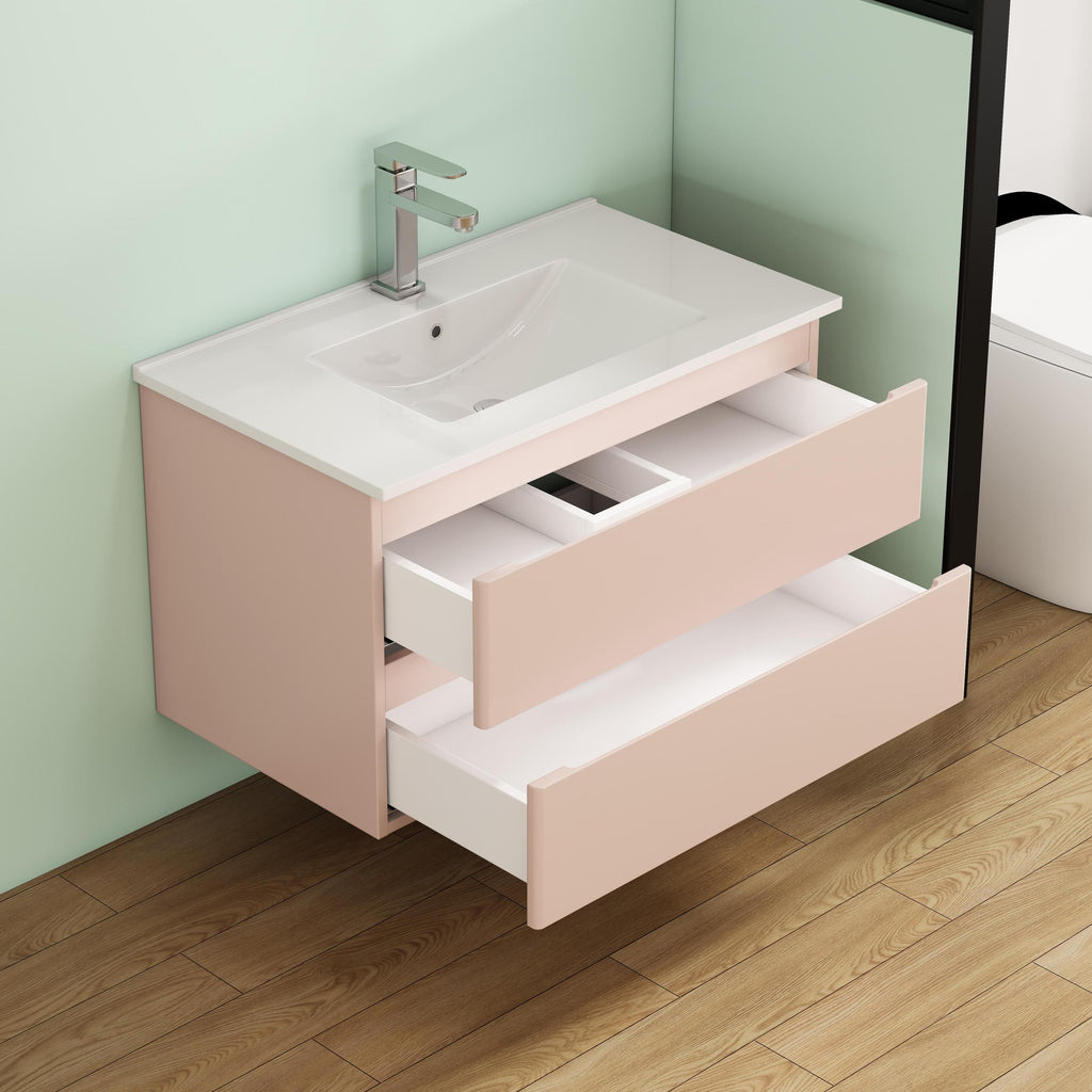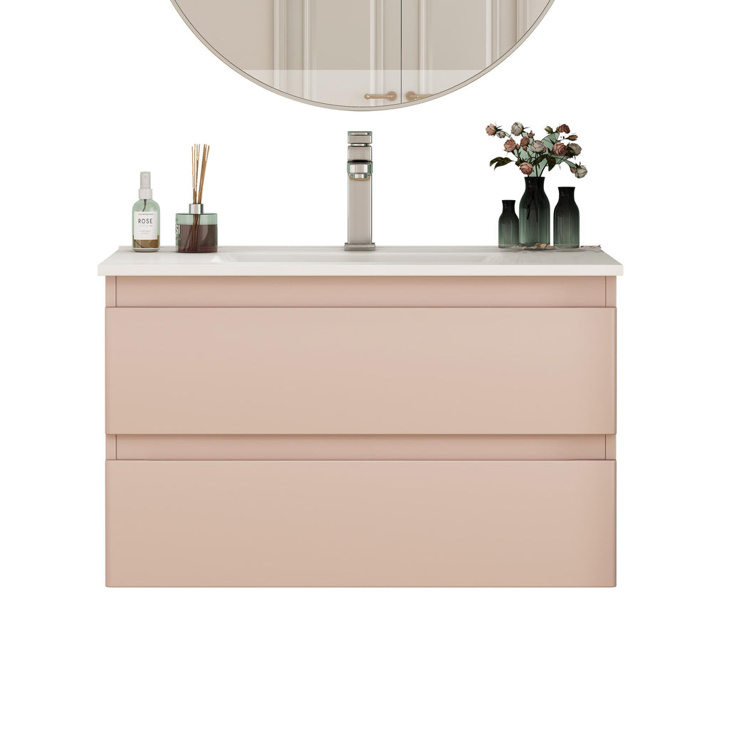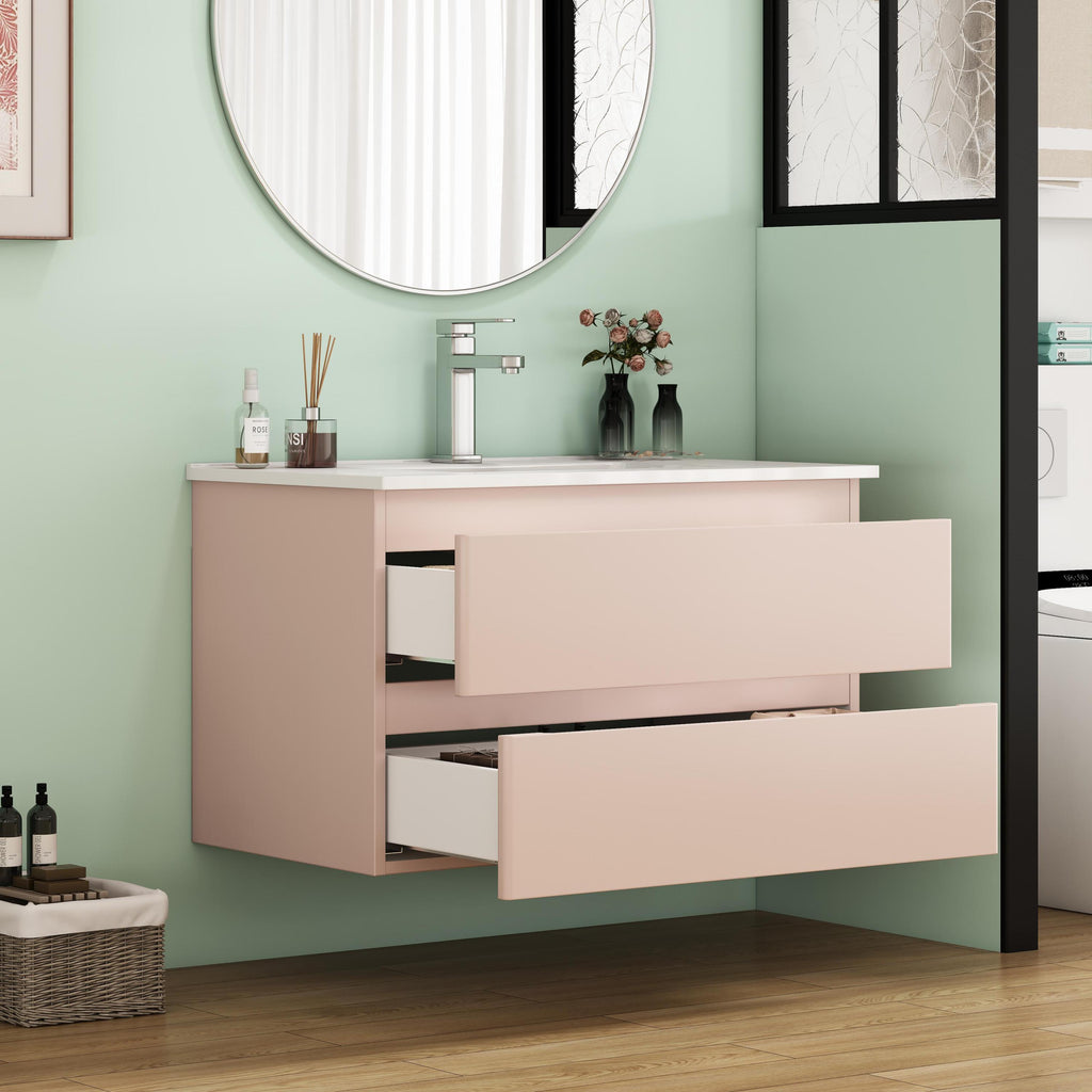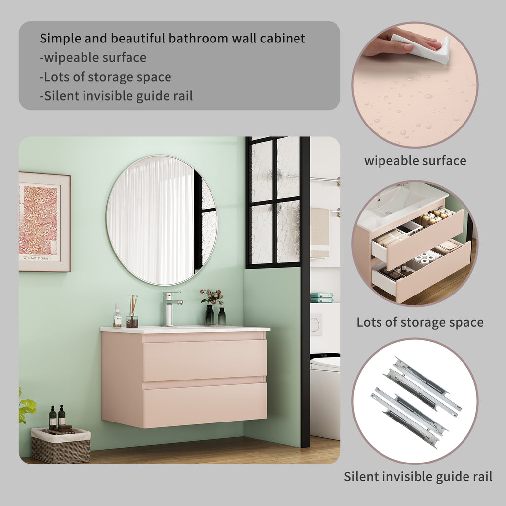 - Designed for easy assembly, this vanity comes with pre-drilled holes, clear instructions, and all hardware—no professional skills needed. The wall-mounted design saves precious floor space, making small bathrooms or apartments feel open and airy 。Note: Faucet not included, letting you customize with a style that enhances your pink decor vision.