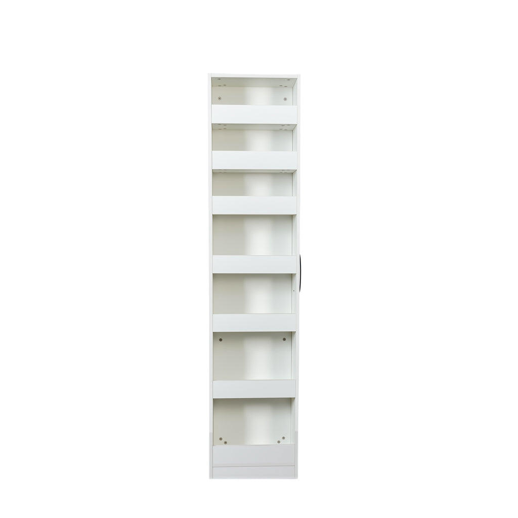 Versatile Storage: This 7-tier multi-functional pull-out multi-tier storage shelf offers ample space to organize and store kitchen or office essentials in a compact footprint. Ample Storage: With 7 open shelves, this organizer provides ample space to store and display pantry items, bottles, jars, and more. Convenient Handle: The handle allows for effortless maneuverability when transporting the shelf. 【Slim Design】This storage shelf is only 7.87 inches wide, designed perfectly fits between refrigerator/counter, washer/dryer, or tight corners. Maximize every inch of space in your home, it is a small house storage savior.