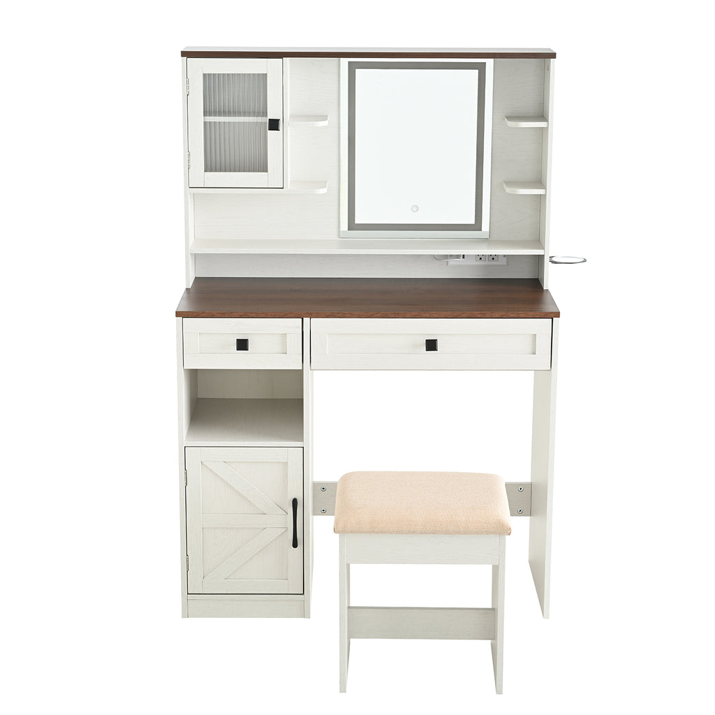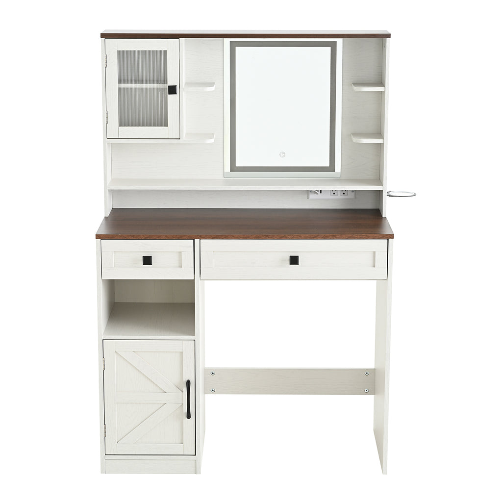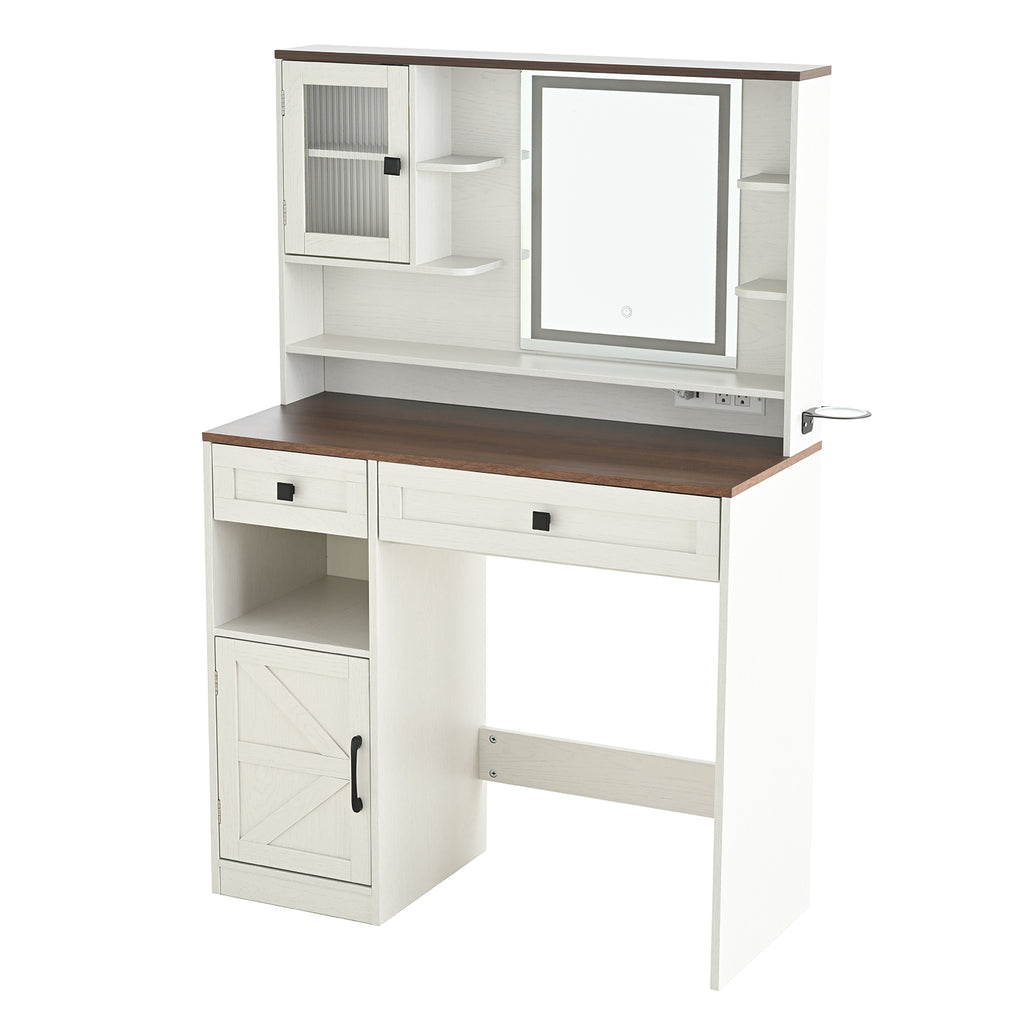 - Multi-functional Storage Space:This practical barn-style vanity has two drawers in different size, two cabinets,a open storage layer,two three-tier shelves, perfect for organizing cosmetics, skincare products.There's also a metal ring beside the tabletop for hanging the hair dryer.The beauty station keeps everything tidy and easily accessible.