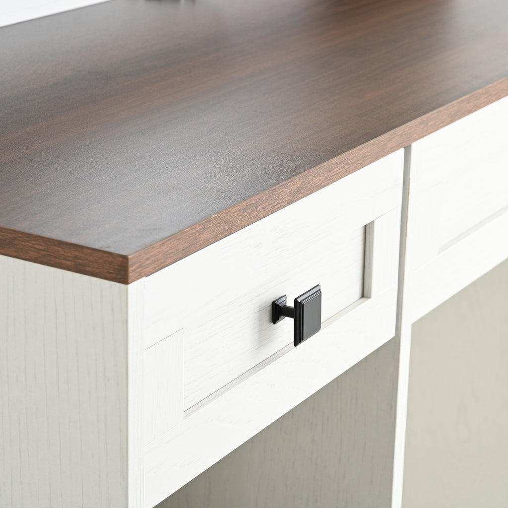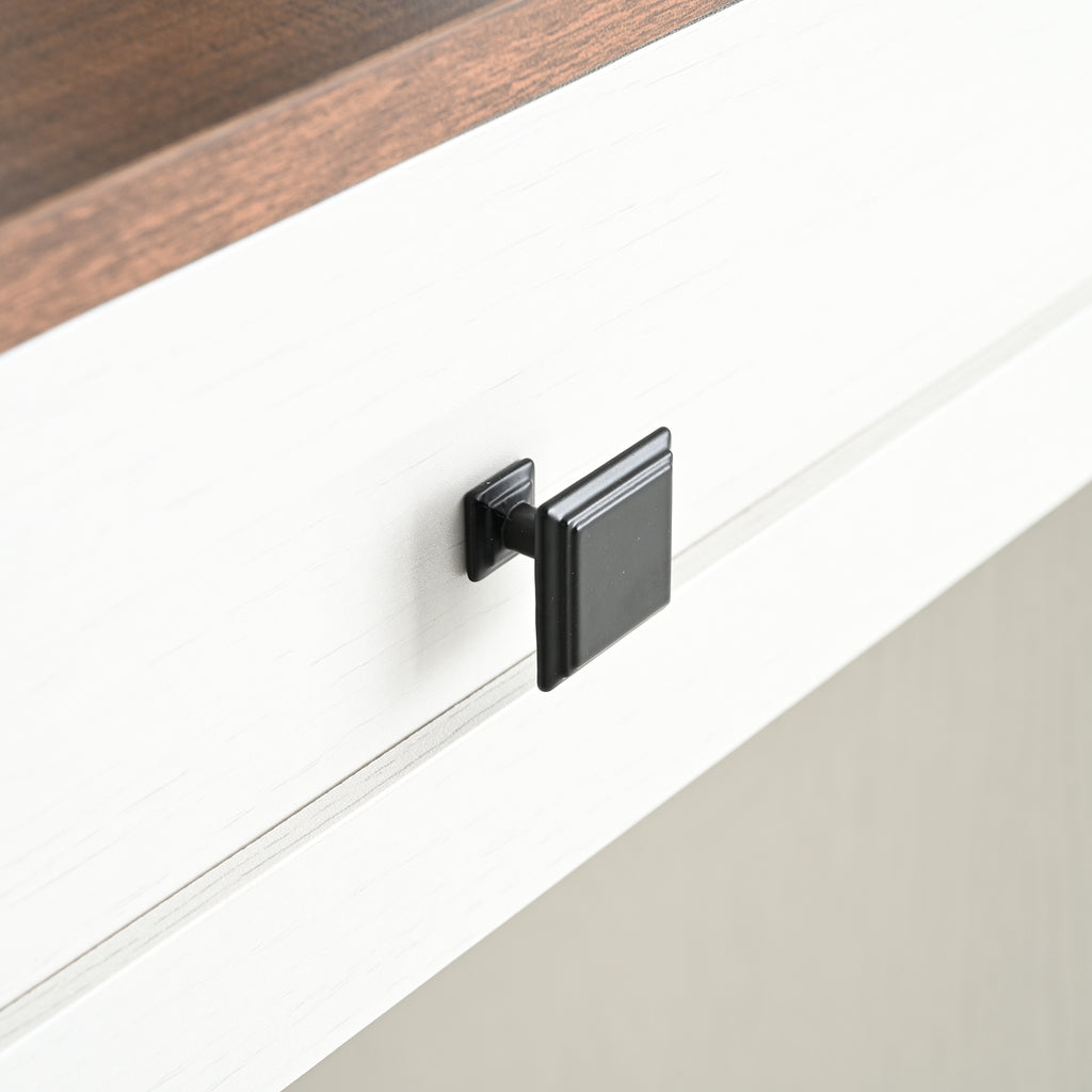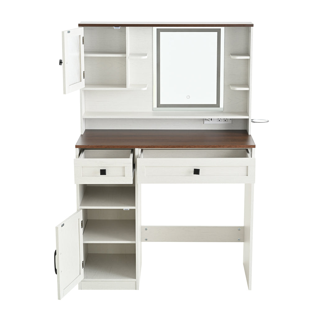 - Multi-functional Storage Space:This practical barn-style vanity has two drawers in different size, two cabinets,a open storage layer,two three-tier shelves, perfect for organizing cosmetics, skincare products.There's also a metal ring beside the tabletop for hanging the hair dryer.The beauty station keeps everything tidy and easily accessible.