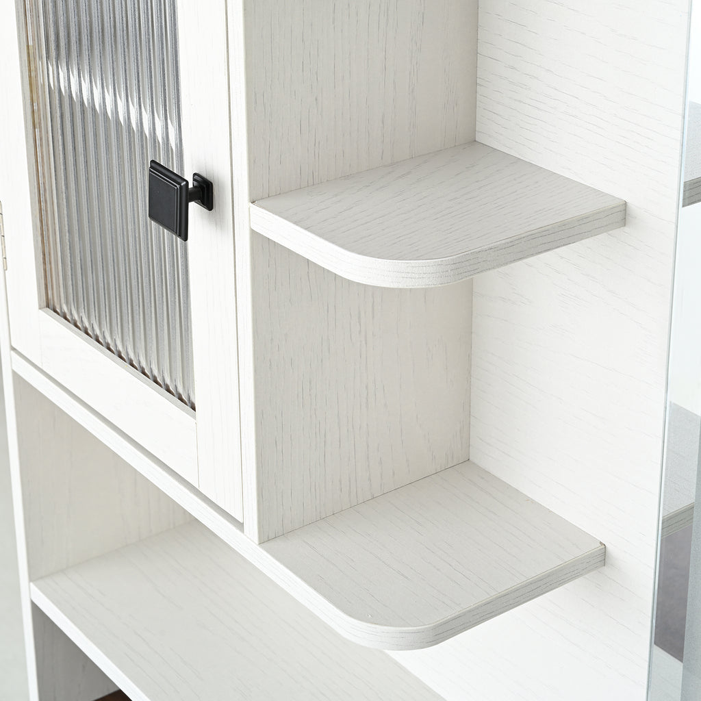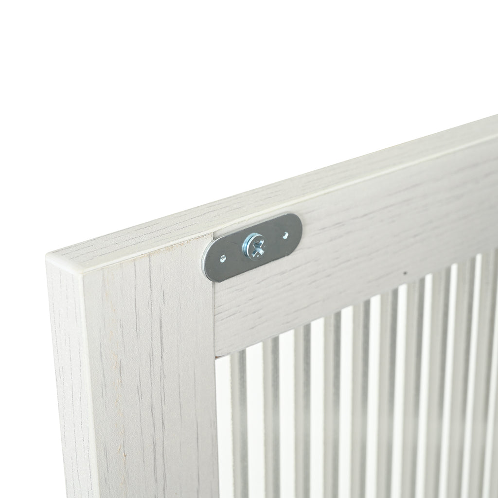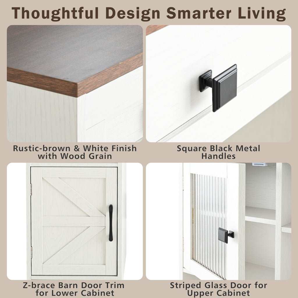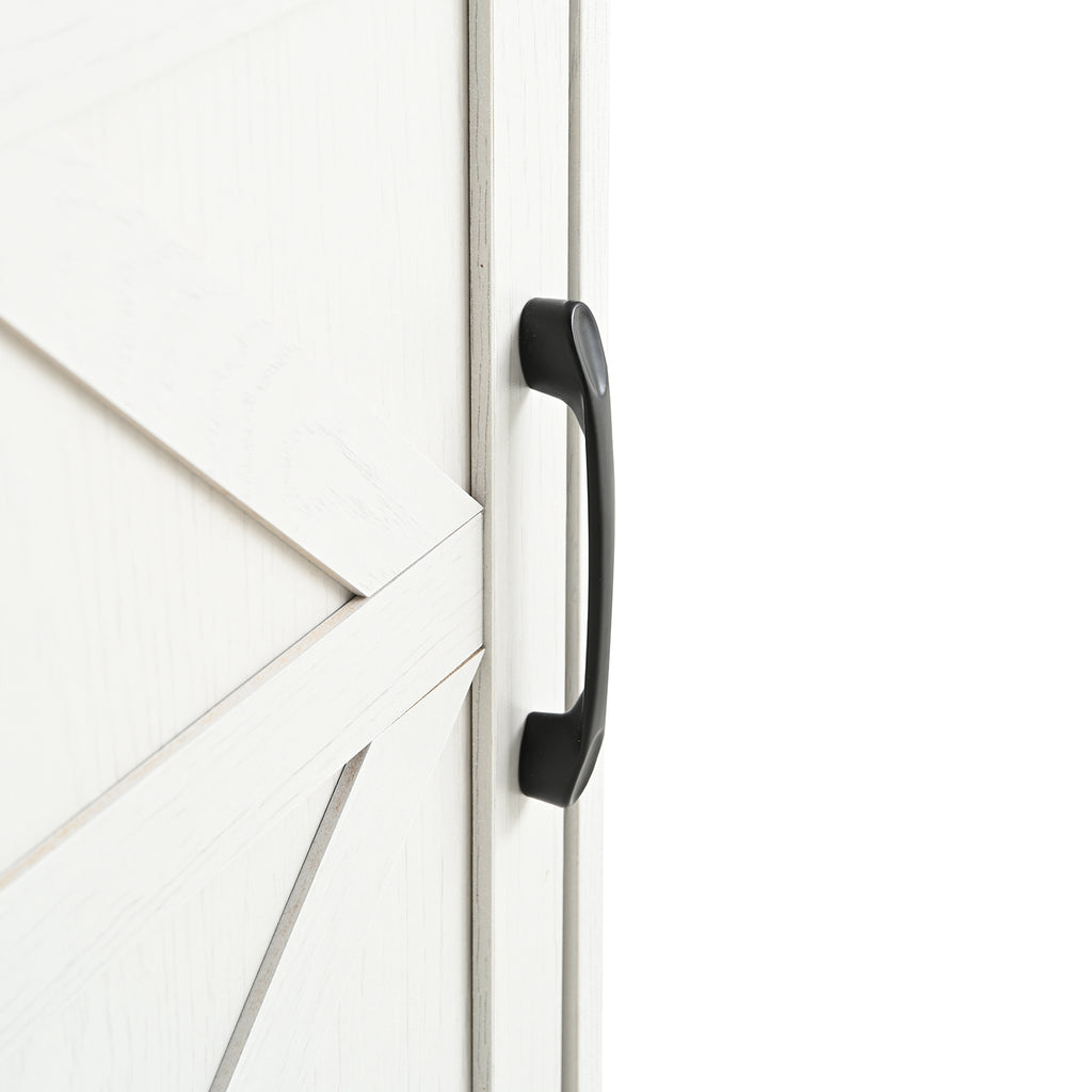 The makeup vanity is a perfect blend of distressed white finishes and z-brace barn door trim. The striped semi-transparentglass door and square metal hands also has farmhouse charm and add a relaxed, earthy aesthetic to the room.