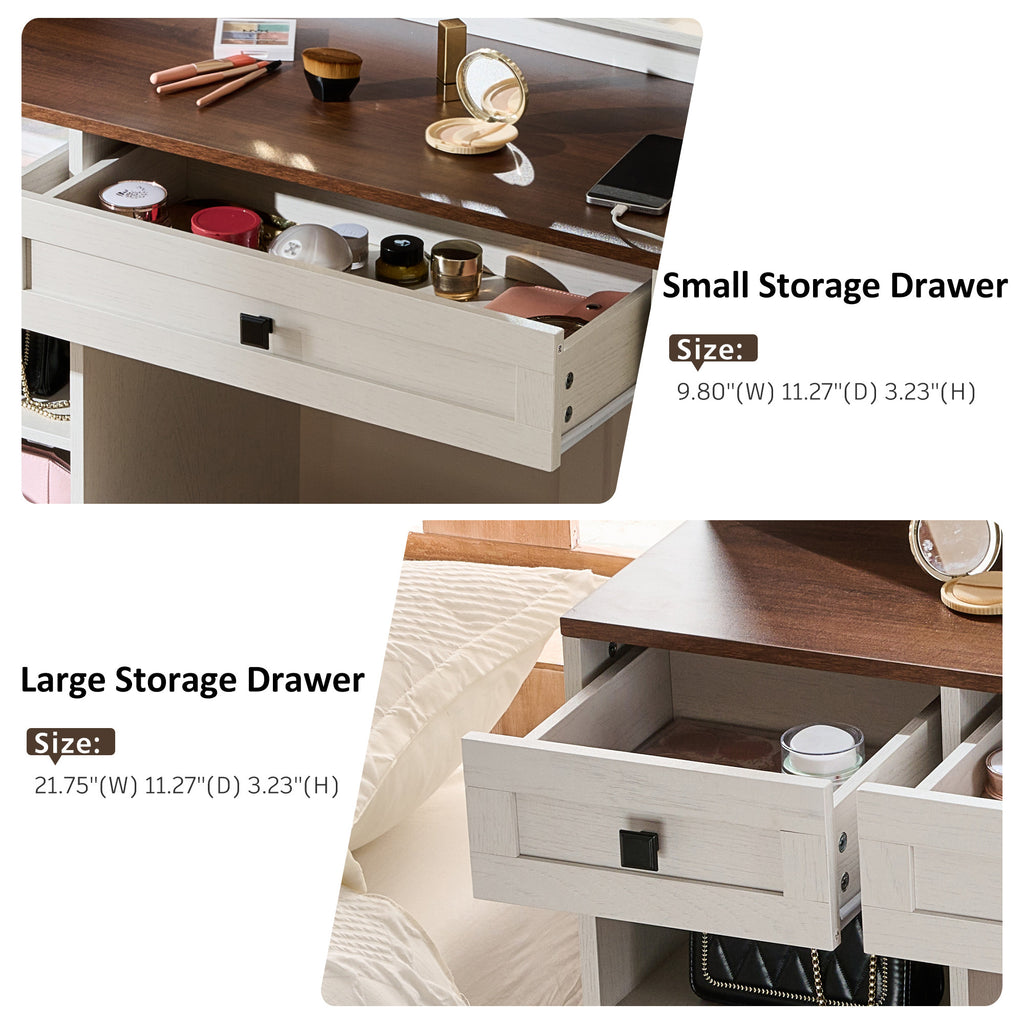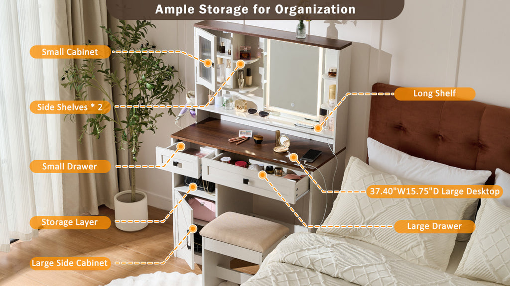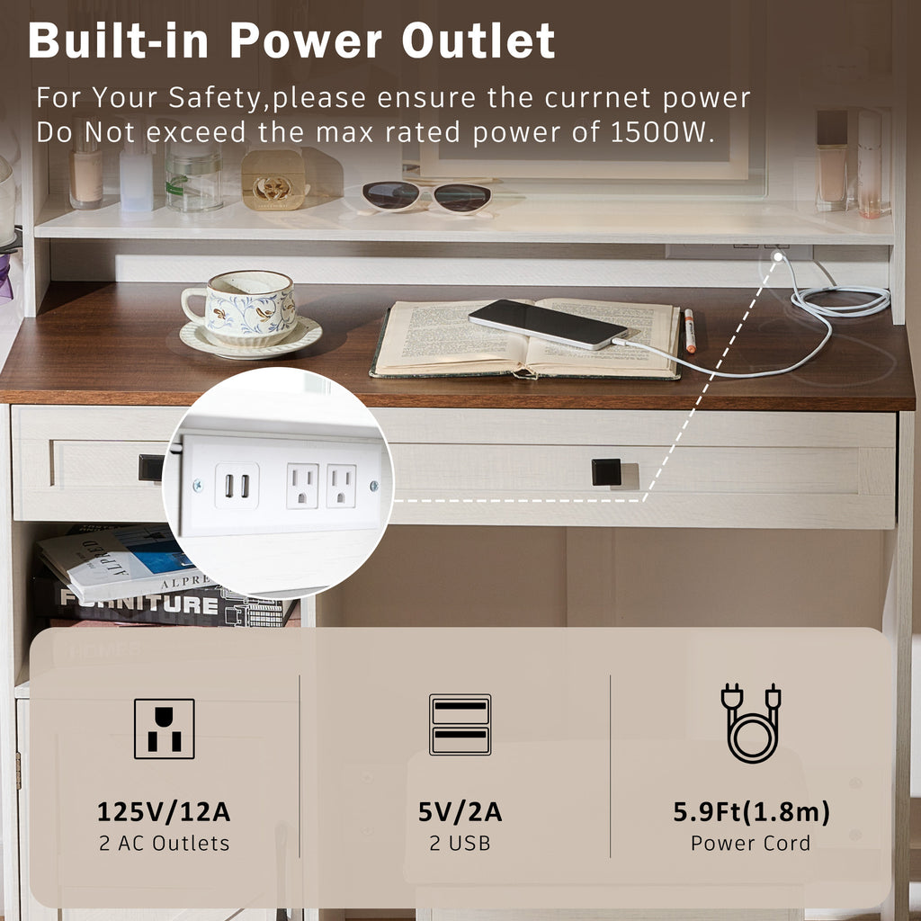 - Built-in Power Outlets: Equipped with 2 USB ports and 2 AC power outlets, this vanity makes it incredibly convenient. It allows you to easily use a variety of small appliances such as hair dryers, cell phones, curling irons and more. Everything you need is within reach for a smoother beauty routine.