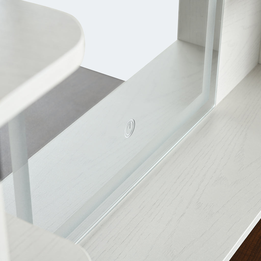 The dressing table has a makeup mirror with three modes, cold white, warmwhite and warm yellow. You can make the change with a easy touch on the mirror.There is also a built-in power station with 2 ACoutlets and 2 USB for electrical devicessuch as hair dryer, mobile phone and laptop if necessary.
