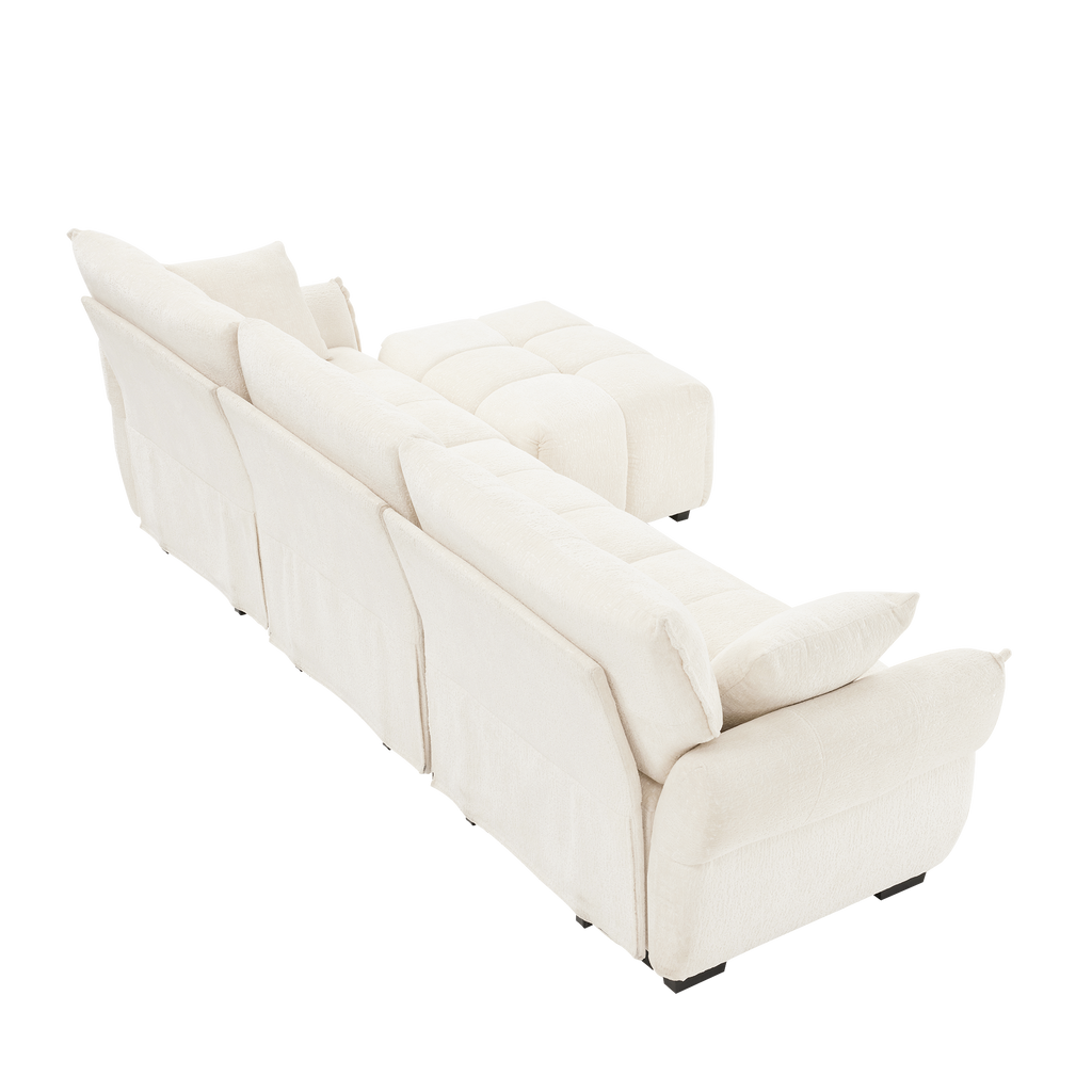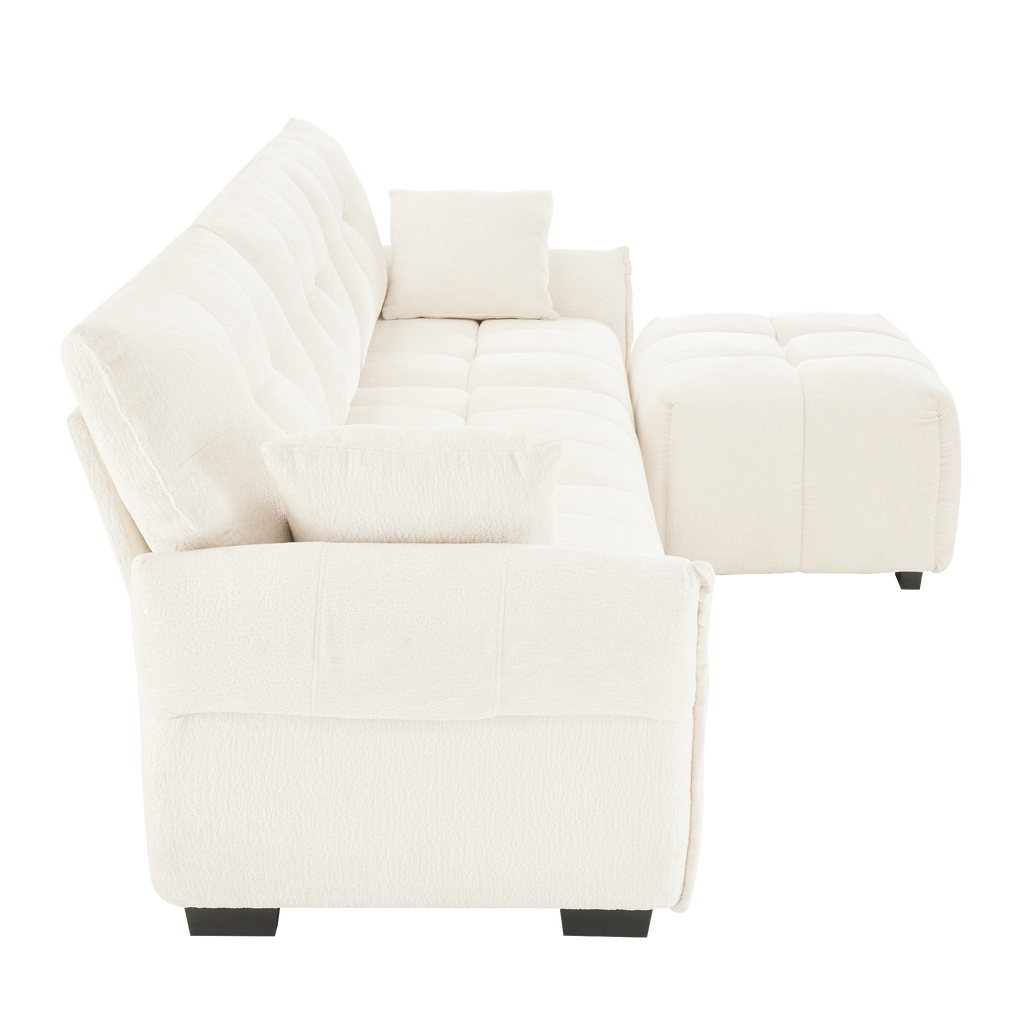 Elegant Three-Seater Sofa Set with Ottoman and Pillows, High-Resilience Cushions, White Textured Chenille, Solid Wood