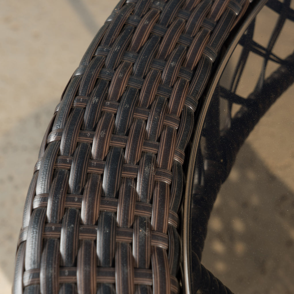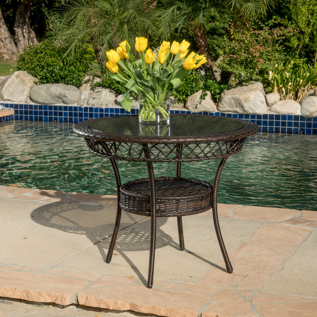• Unique Design: Much like its 27' counterpart, the Figi Multi-Brown PE 34 Glass Table is ideal for any host. With a basket below the table allowing for storage options for light items such as napkins, silverware, and condiments for easy access, this table is a unique addition to any patio set.