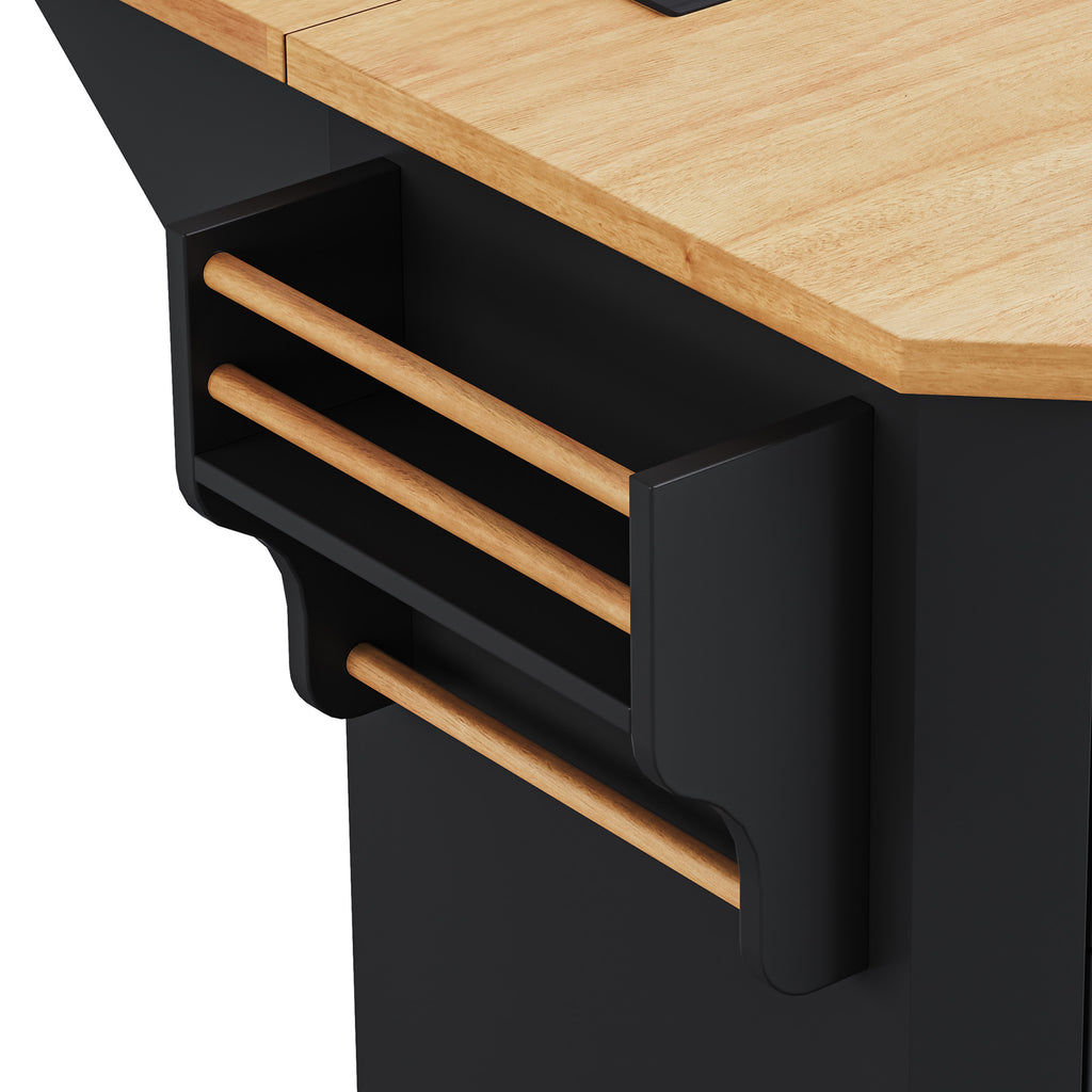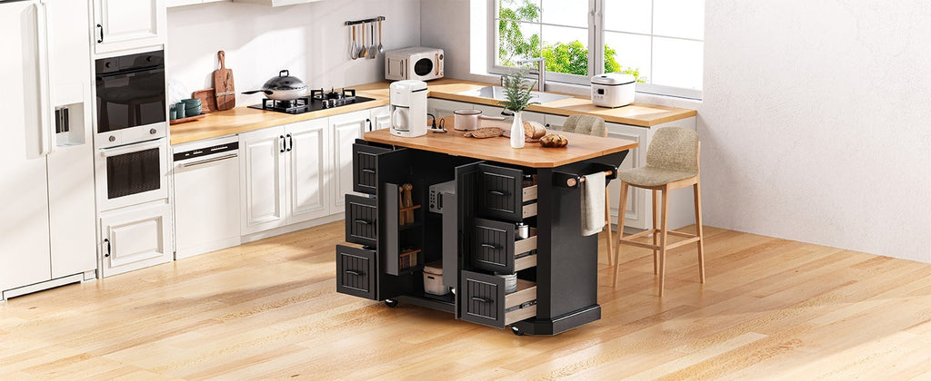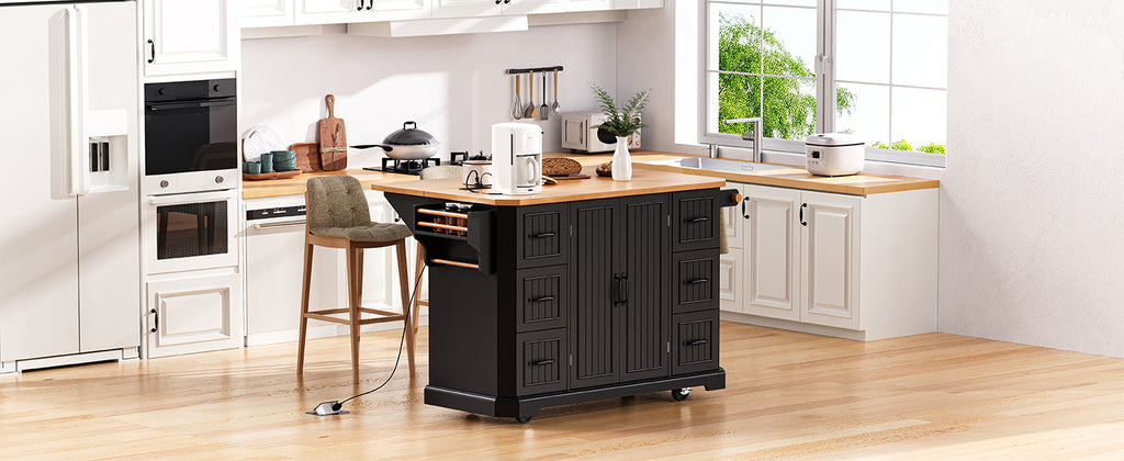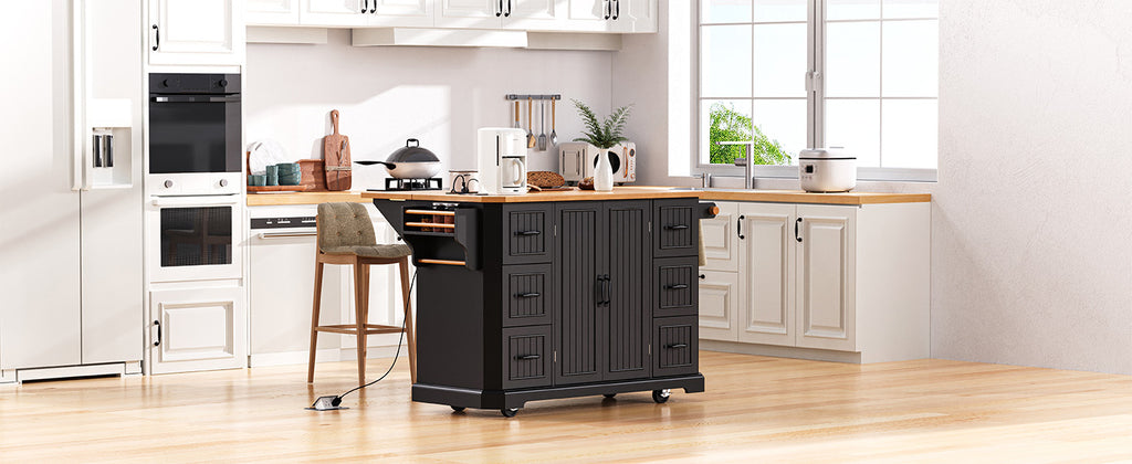 | Summary | Introducing our 56-inch wide, beautifully and elegantly designed kitchen island, a perfect fusion of beveled edges and embossed texture groove barn panel that bring a touch of rustic charm to your home. With its spacious design and durable construction, this island is not just a statement piece but also a practical addition to any dining room, kitchen area. This large kitchen island contains 2-tier door interior storage rack for spice and jars. Power outlet and towel racks on same side add another level of functionality. Crafted from rubber wood table and high quality MDF, it offers ample storage (drawers and cabinets) for your kitchen essentials while blending seamlessly with a variety of interior styles, from farmhouse to modern. |