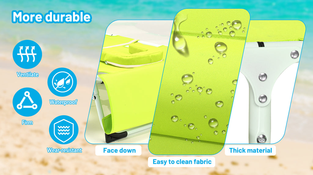 • 【ADJUSTABLE 5 POSITION LOUNGE CHAIR】 : Designed with 5 positions adjustable locking system, this sturdy folding cot allows you to adjust it to a comfortable position as your needs.You can recline or lay flat.This ergonomic design is good for your back, can also help reducing muscle tension and stress.Updated locker system can make sure the sturdy of the chair when you lay on it.