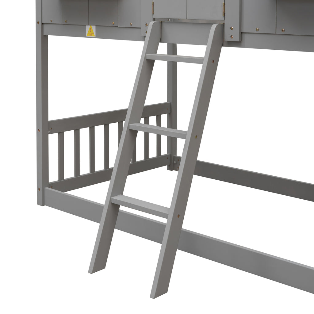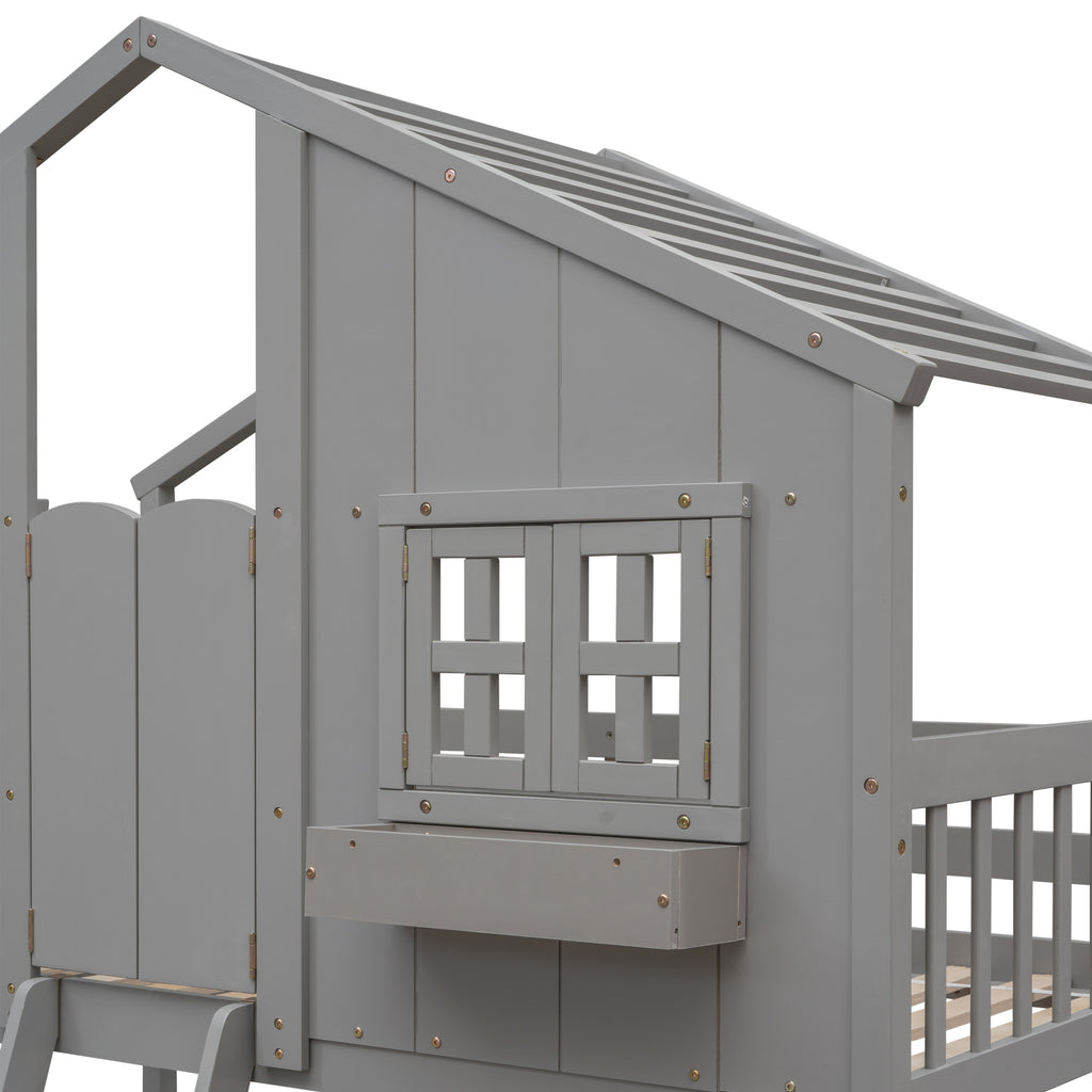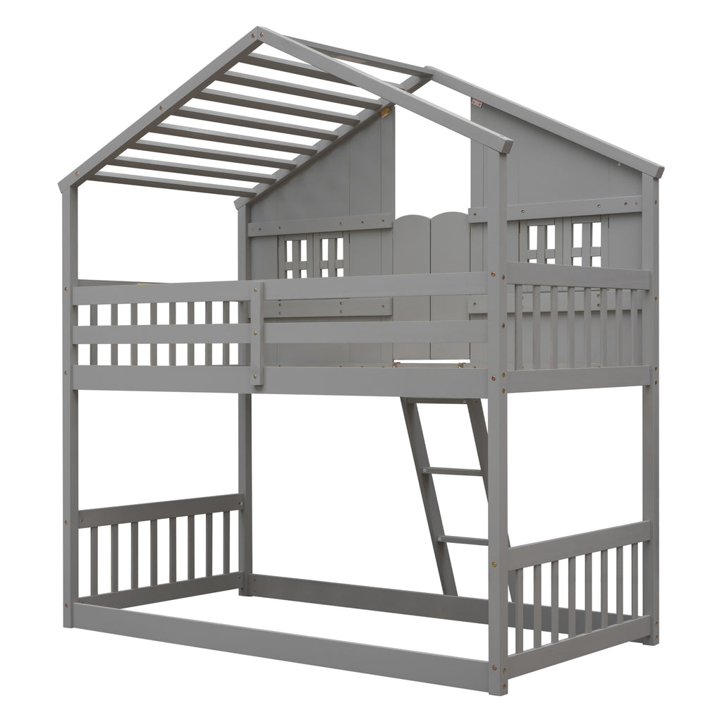 Grey Twin over Twin House Bunk Bed with Roof, Window, Box, and Door - Safety Guardrails and Ladder