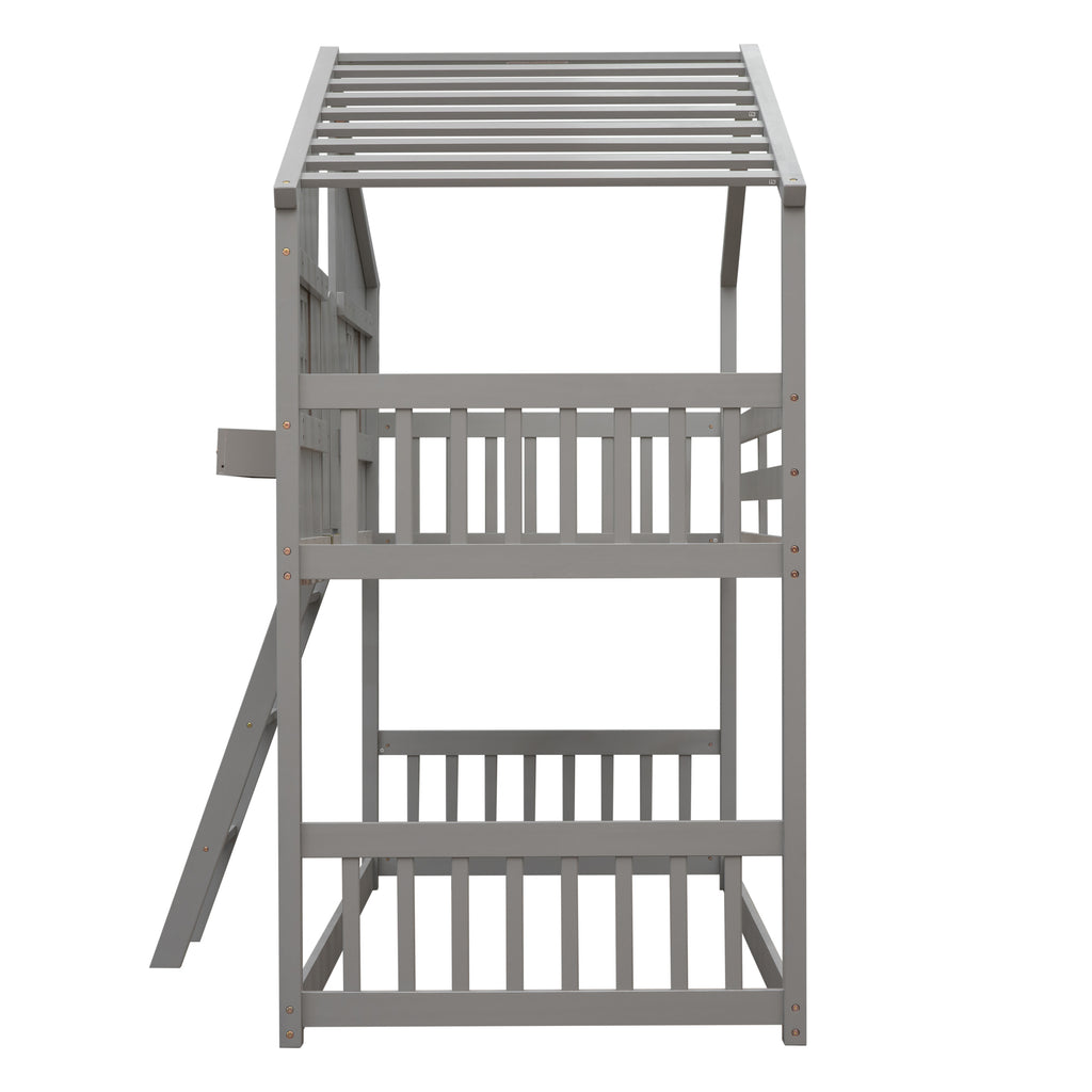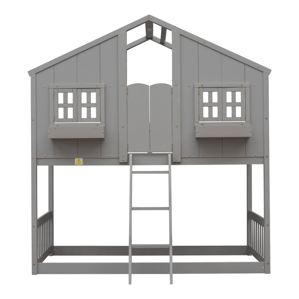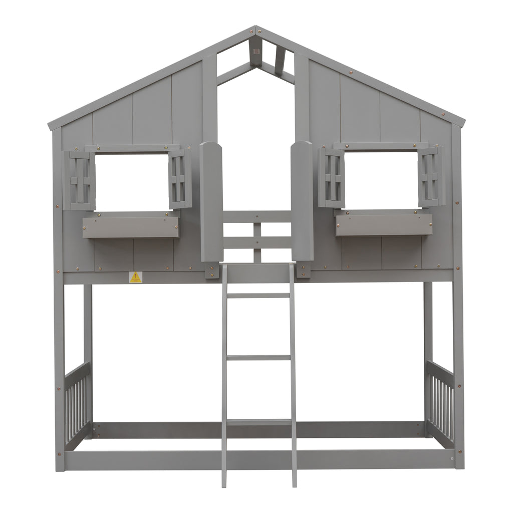 Twin over Twin House Bunk Bed with Roof , Window, Window Box, Door ,Grey