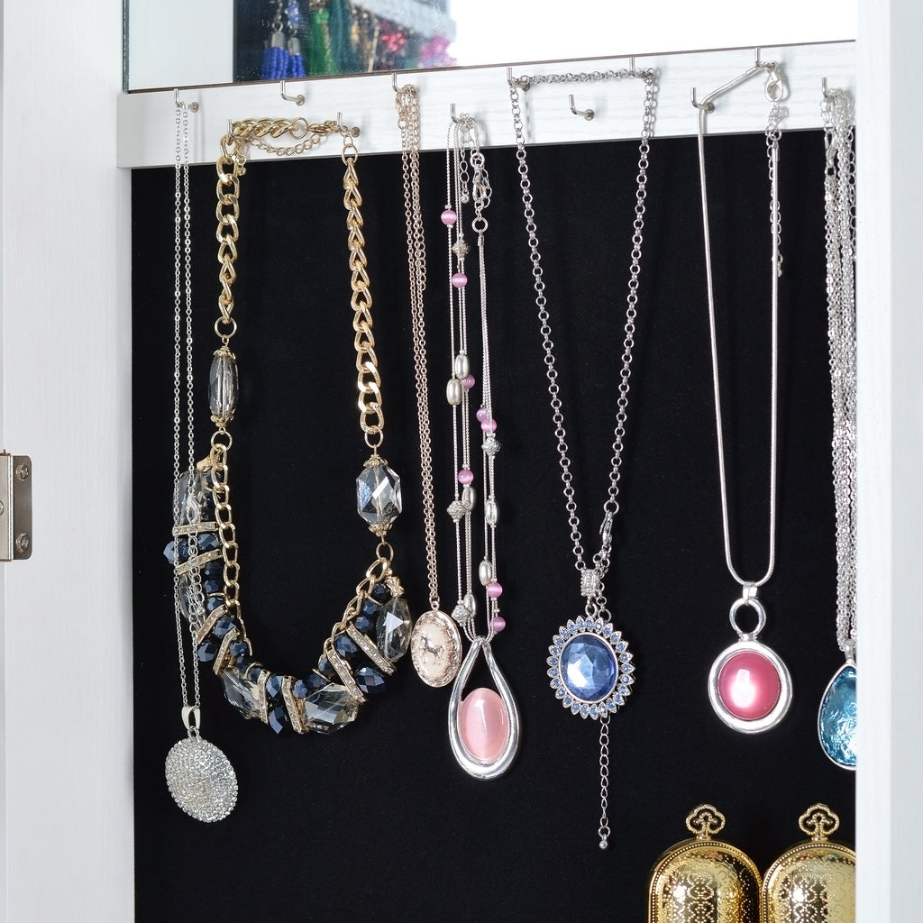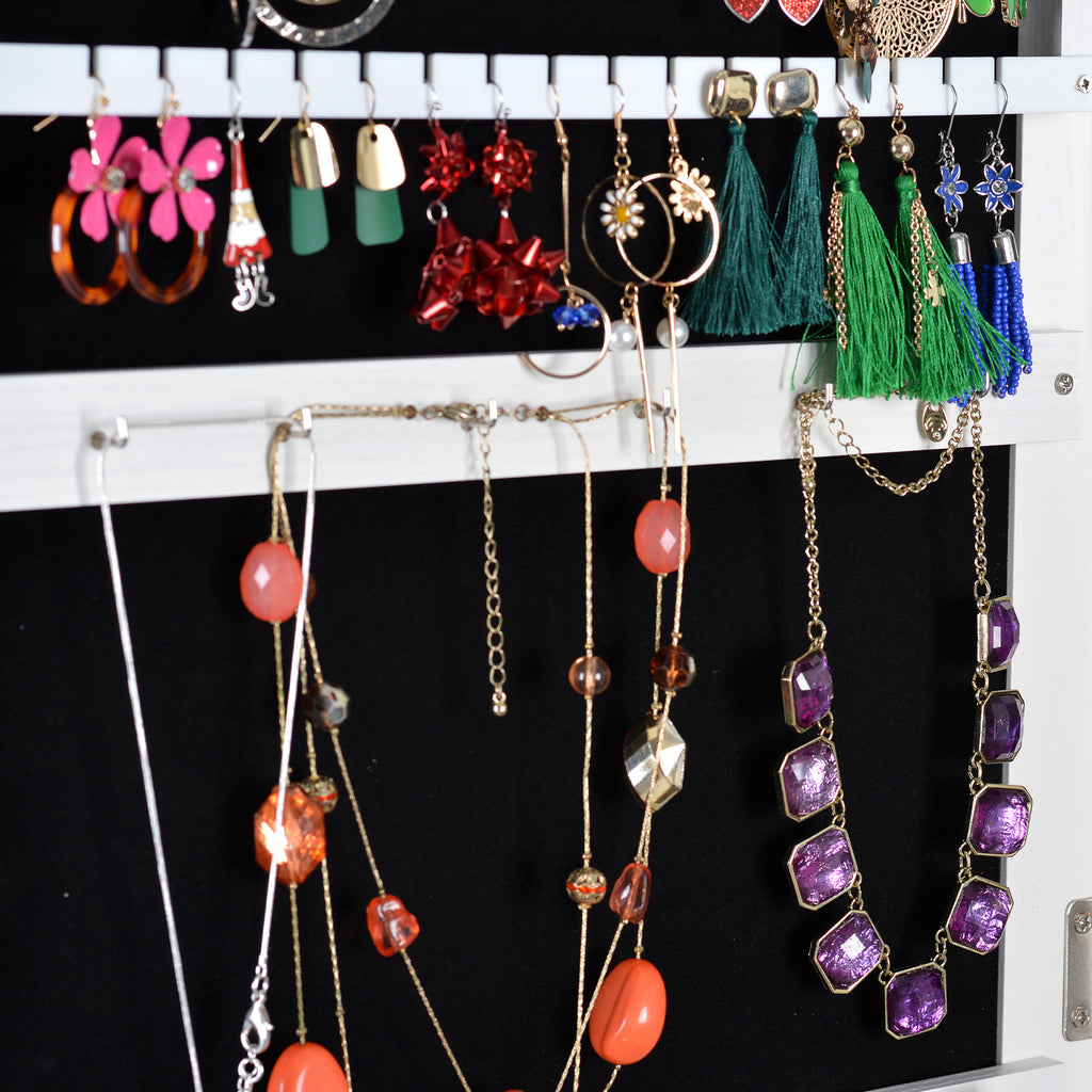 - Ample storage:includes 22 necklace hooks,2 cubes,4 lined shelves and a bracelet rod,and plenty of room for rings and eqrrings.it can hold on the door or wall.