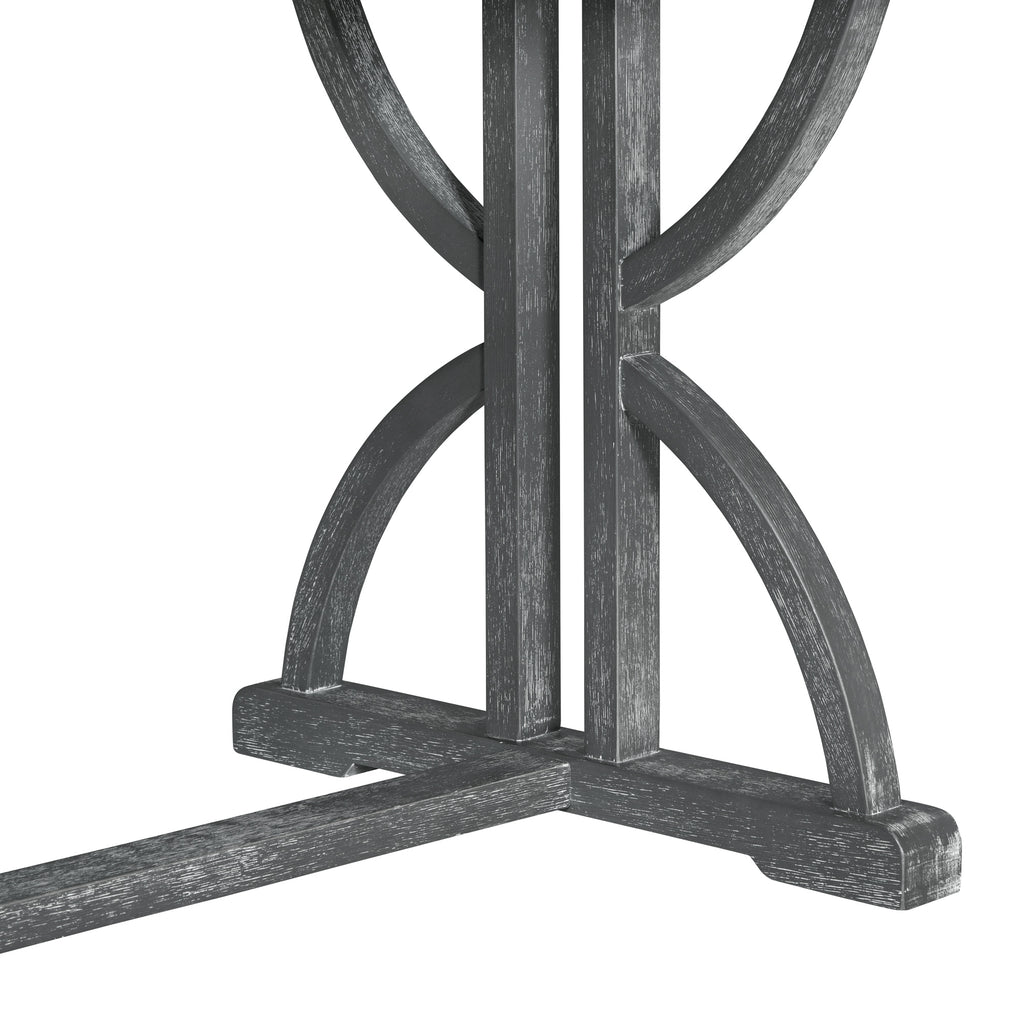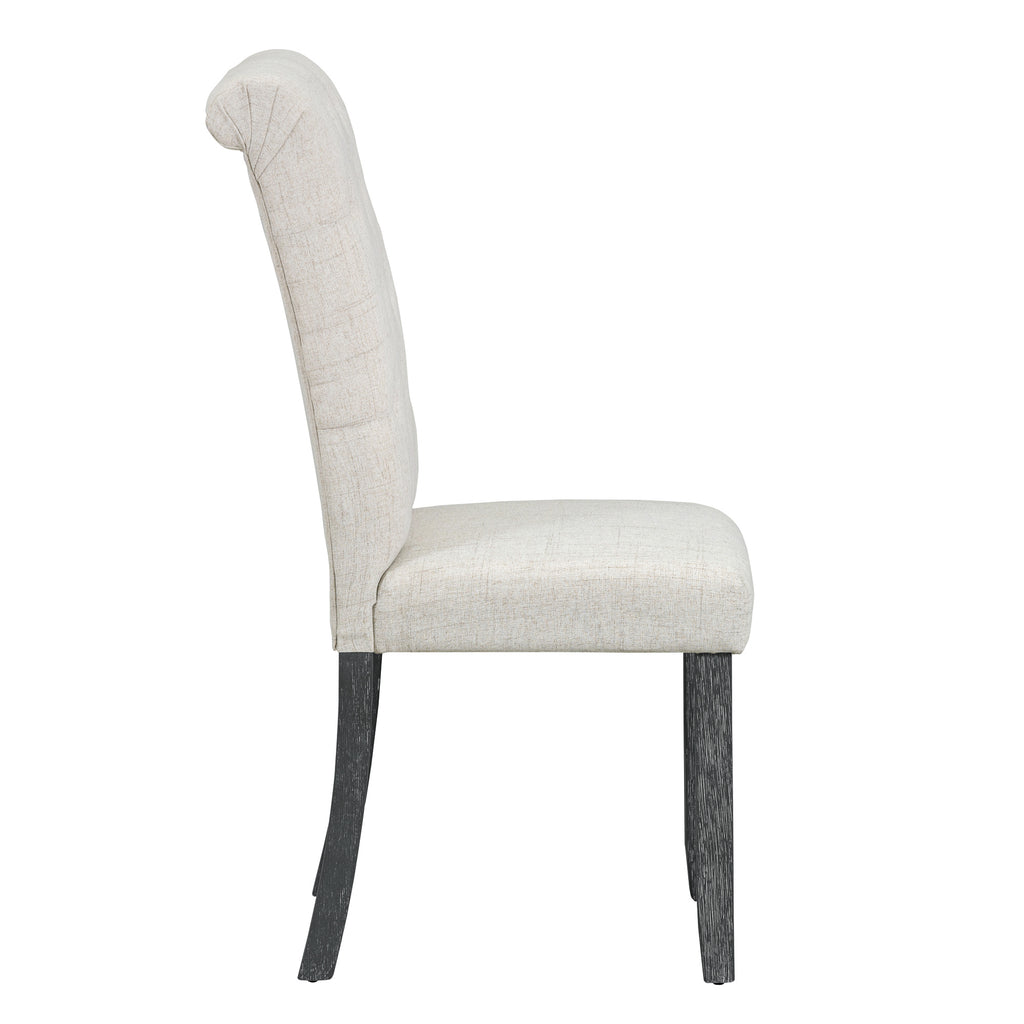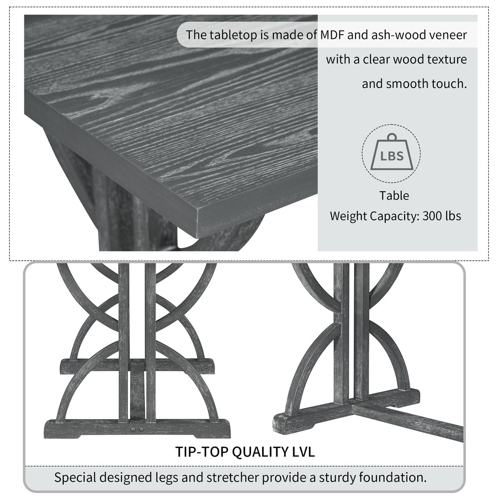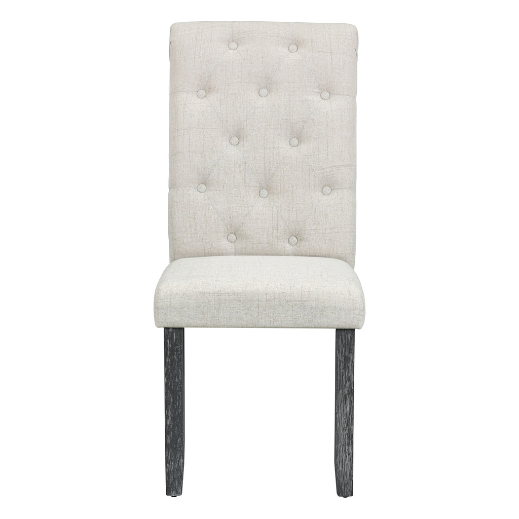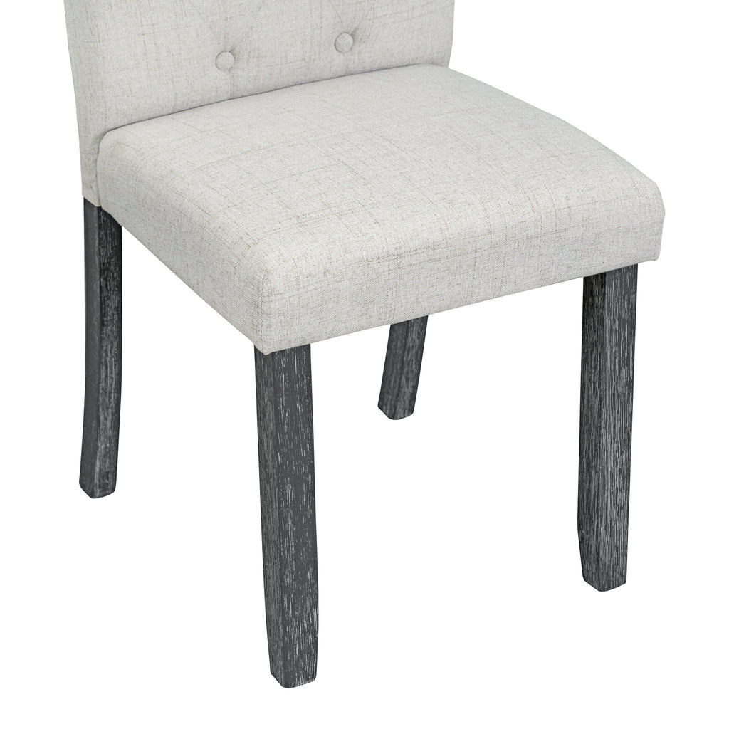 - The natural wood wash and grey finish add a distinctly rustic look that easily updates any household. Special symmetrical pattern design for table legs and button-tufting design of the seating set undoubtedly showcase a classic look, featuring an elegant and retro flair. Thick upholstered backrests of chair sets are in line with ergonomic design, thus bringing superb comfort. Whether used for chic dinner parties or casual family dinners, the dining set is sure to elevate any dining experience.