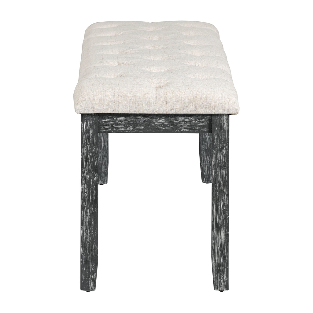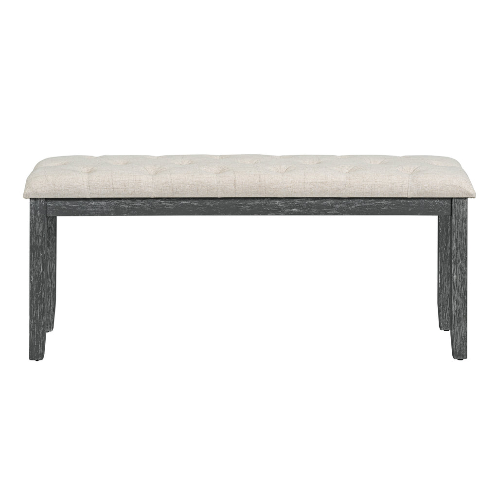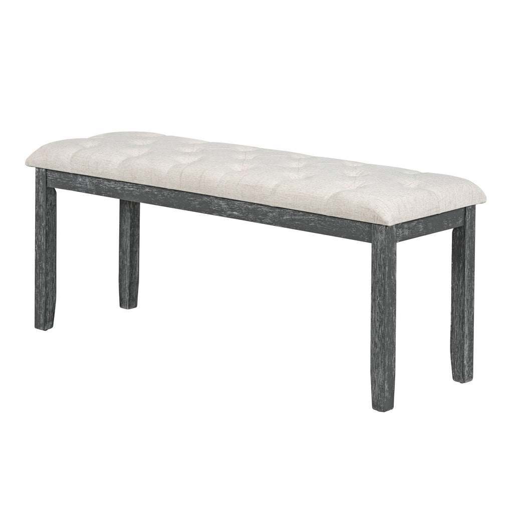 - This dining set includes one table, four chairs and one dining bench, seating up to 6. The dining table can perfectly accommodate your family and guests without making you feel crowded. The spacious tabletop is not only much advantageous for the placement of dishes and other miscellaneous things, such as vases, fruit bowls, candles, etc, beautifully meeting your meal needs. Chairs, as well as the dining bench, are equipped with foam-padded cushions and beige fabric for superb comfort.