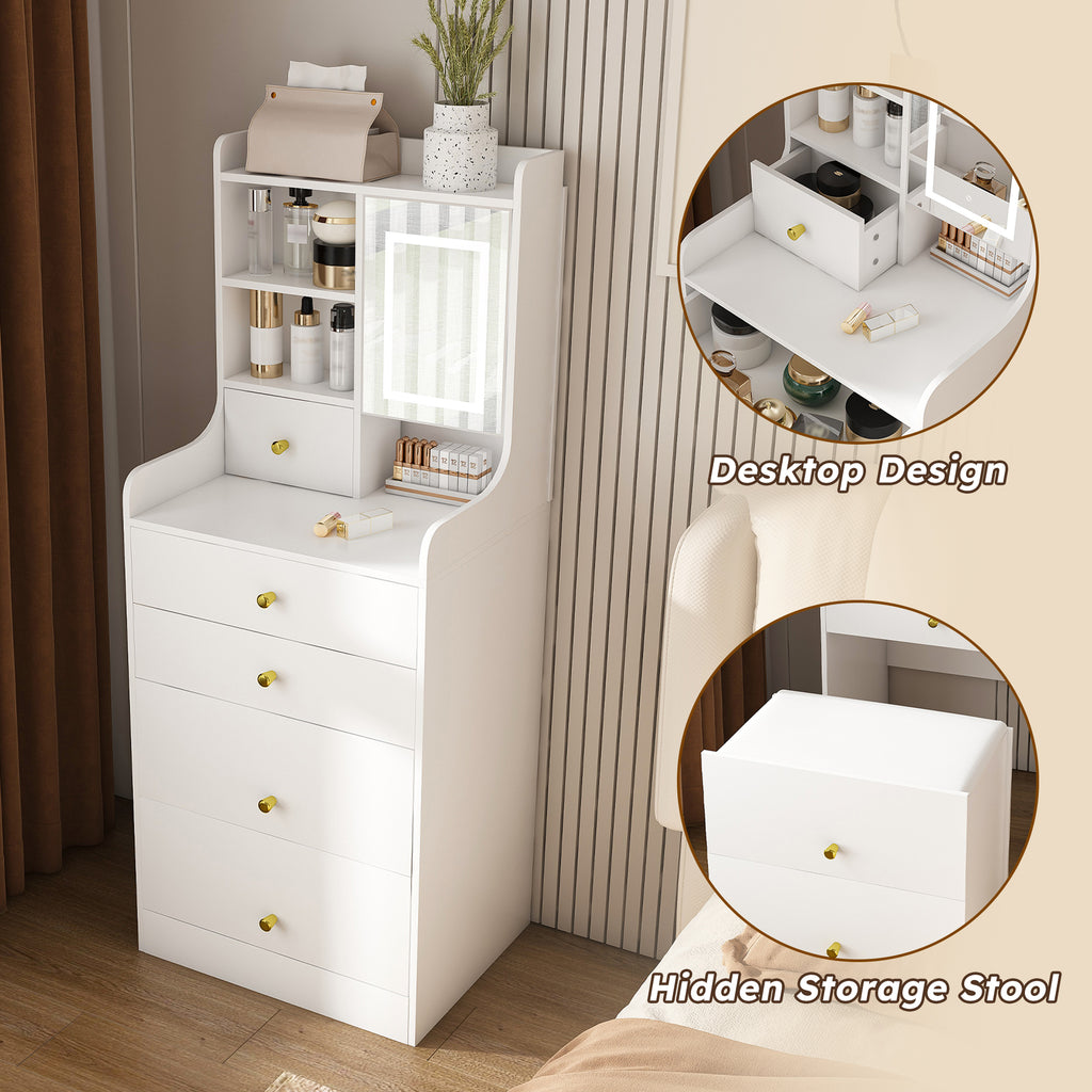 3-in-1 Dressing Table with LED Mirror & Storage Stool, Compact Makeup Vanity, White MDF, 50.39x19.69x15.75 inches