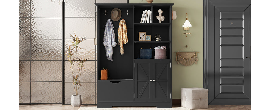 - Various Storage Option: This Hallway Tree comes with 1 large shoe cabinet, 1 large drawer, 4 shelves of varying sizes, and 5 hooks, providing ample storage space for your coats, hats, shoes, and other items. This hall tree will make your hallway less cluttered.