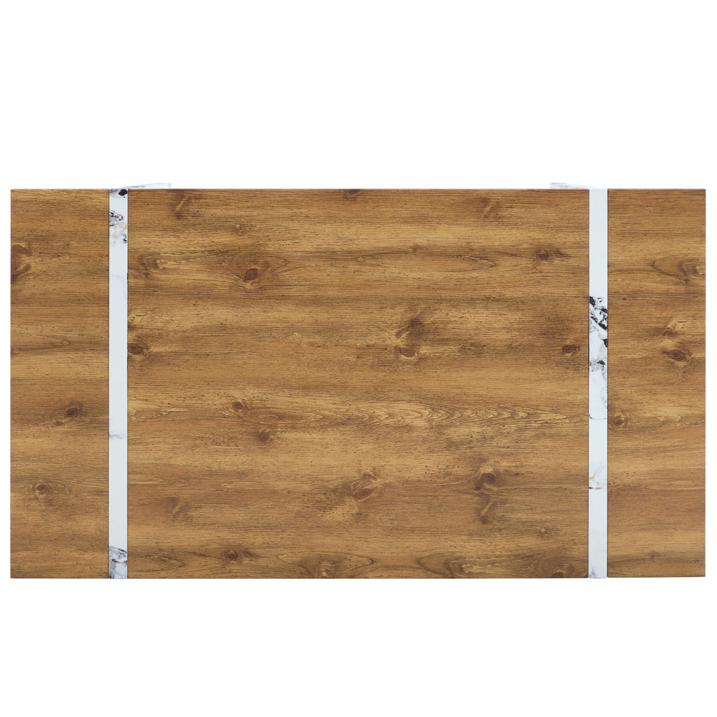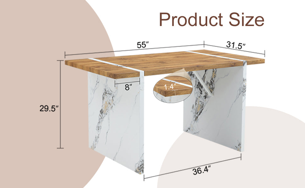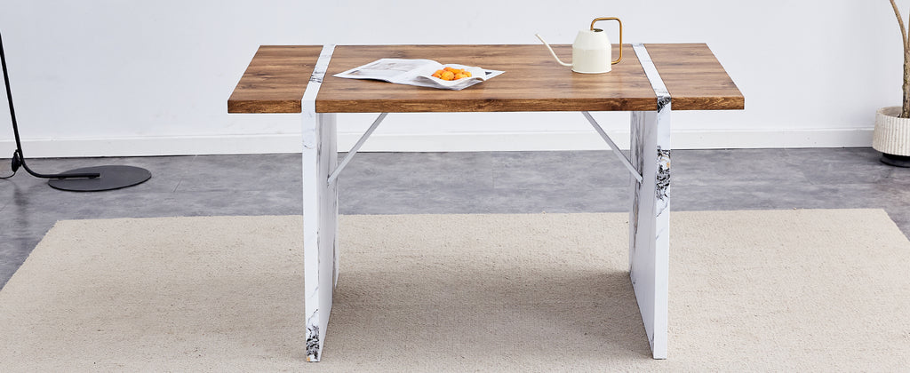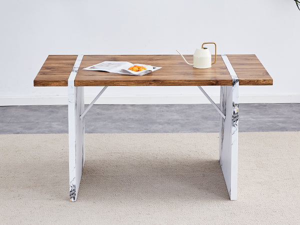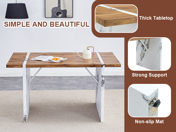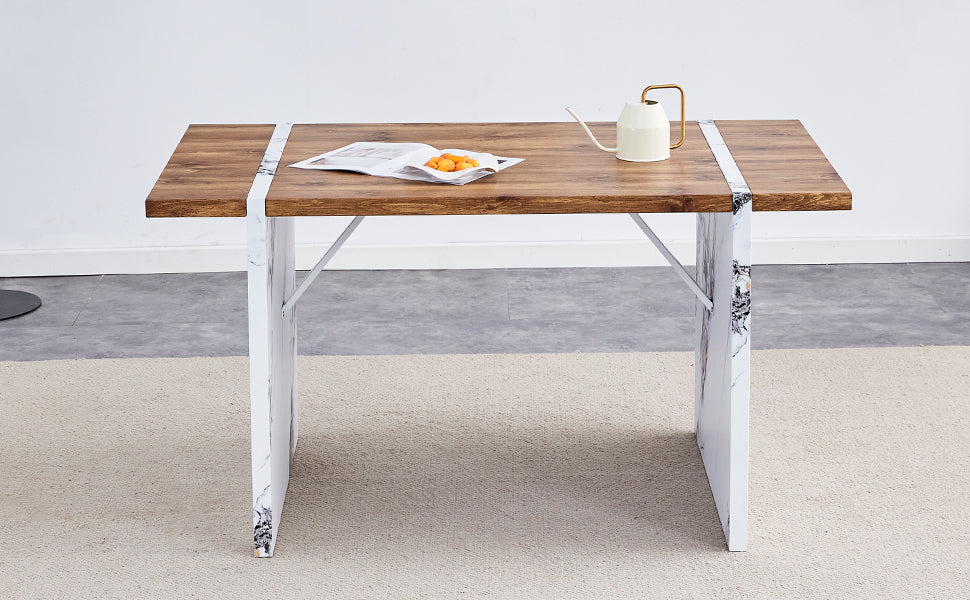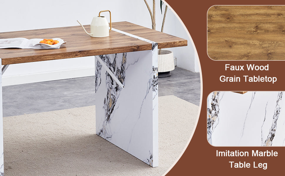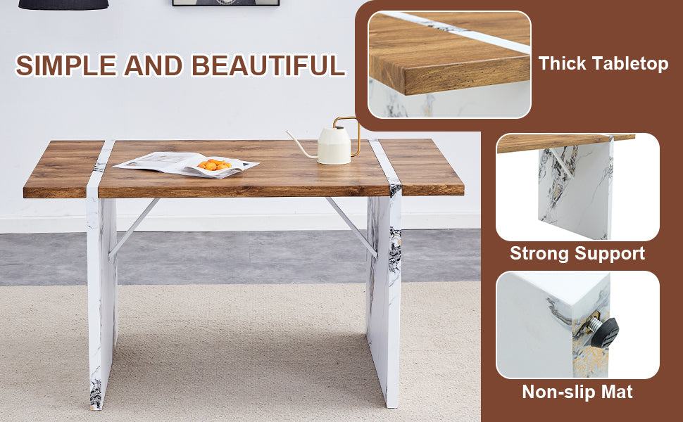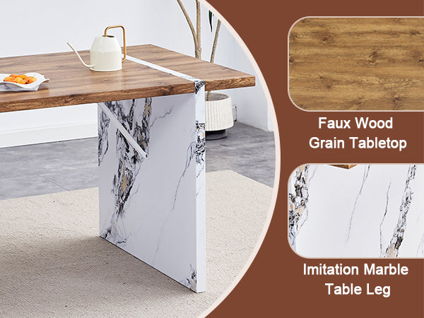Farmhouse-Meets-Elegance Design – Features a warm wood veneer top paired with sleek marble-style legs, blending rustic charm with modern sophistication