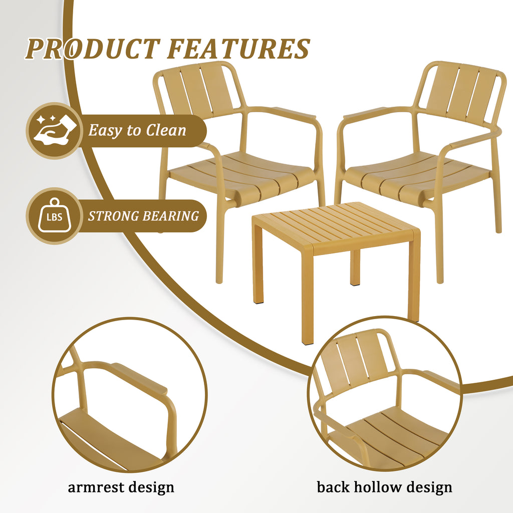 Three-piece indoor/outdoor leisure table and chair set (two chairs and one coffee table), UV-resistant, waterproof and durable, brick yellow, 25*20.47*27.56 (in)/19.69*19.69*14.96 (in), Polypropylene.