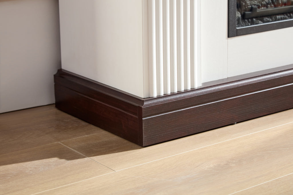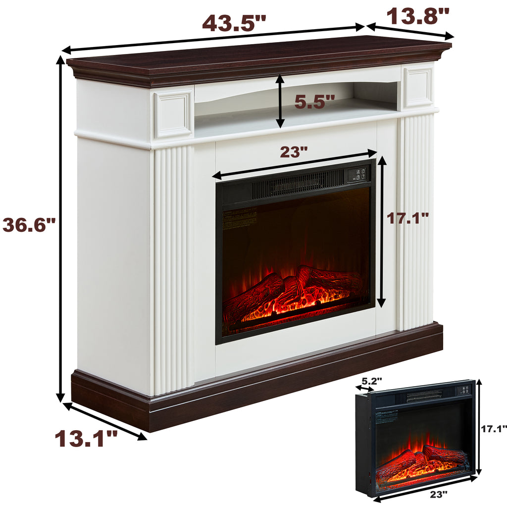• 44' Fireplace mantel with LED Flame, made of High-density hardwood material and finished in brown/white woodgrain, side columns with carved deco. This fireplace mantel is beautifully crafted in a vintage and classic combination design.