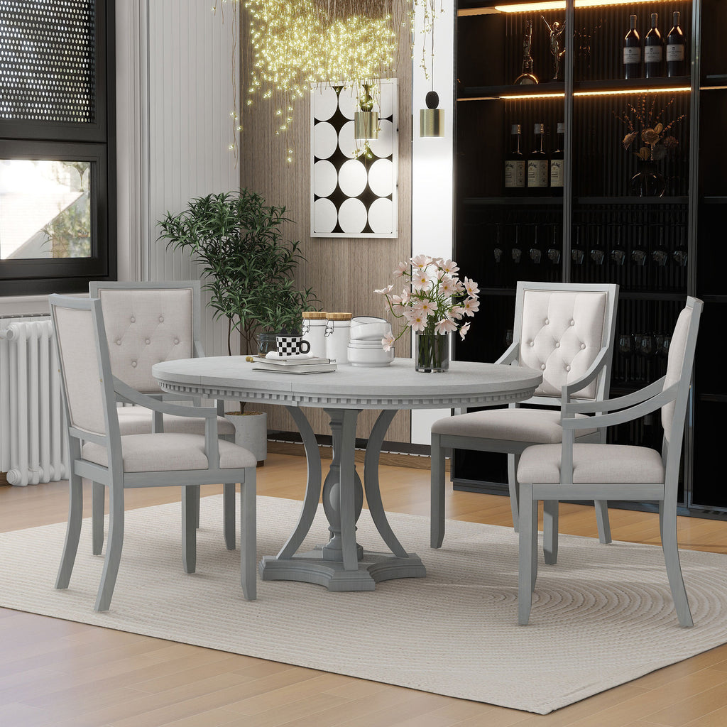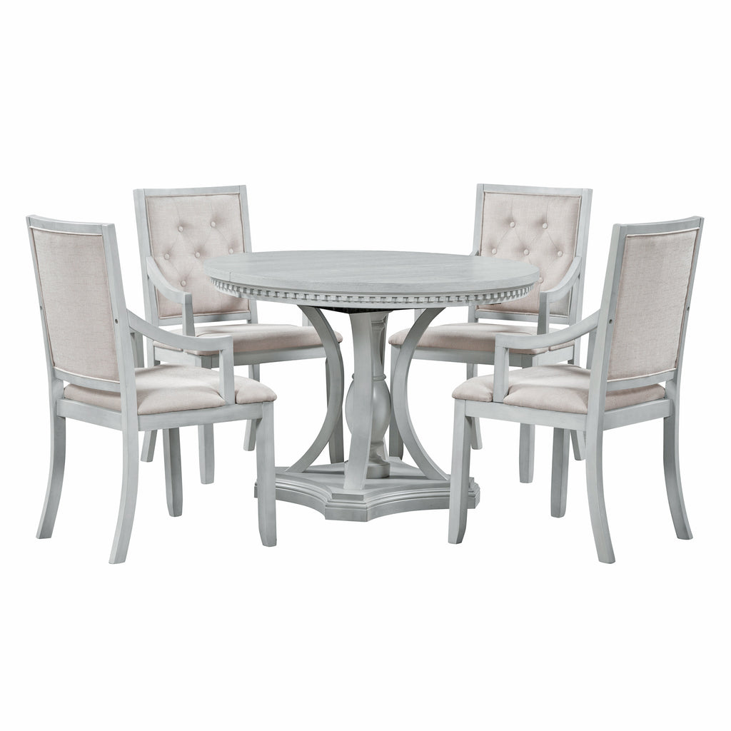 - 5-piece Dining Set: Retro-style dining set, including a round table and four chairs. Can accommodate 4 people. Perfect for the whole family to enjoy a sumptuous dinner together. With a strong farmhouse feel, this dining set creates a romantic and elegant atmosphere for your dining room.