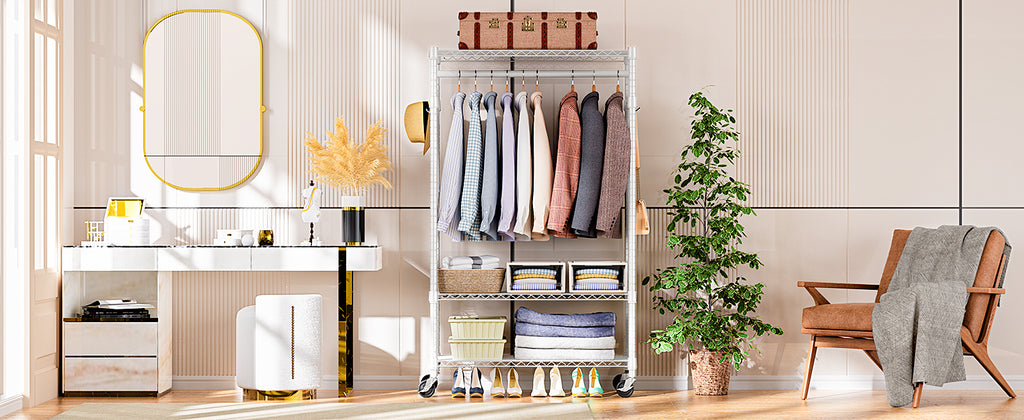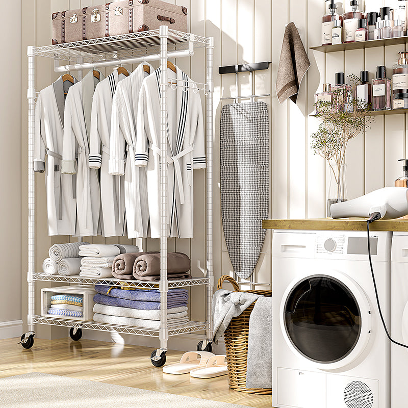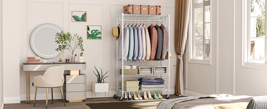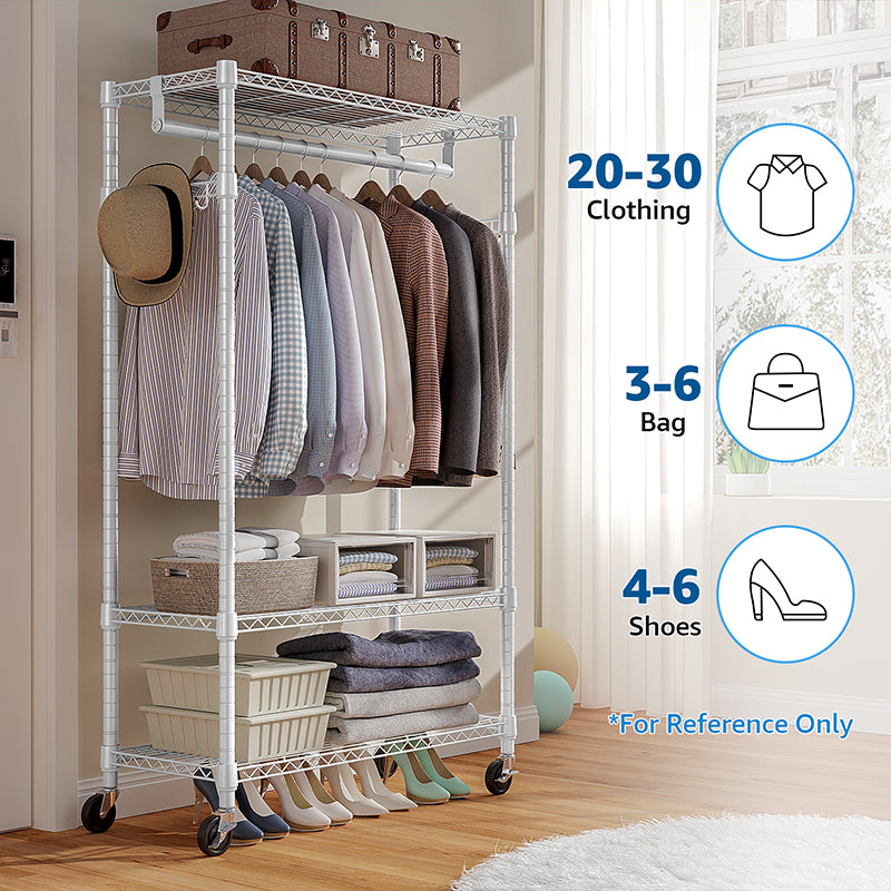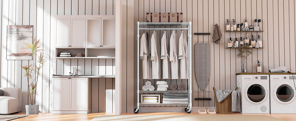 • Lockable 360° Wheels And Multifunctional: This rolling clothes rack has 4 heavy-duty rolling wheels, and thus you can easily move anywhere you need, such as the entry closet, laundry room, hallway, balcony, bedroom, cloakroom, bathroom, garage, and more. And 2 of them are lockable, which ensures more safety